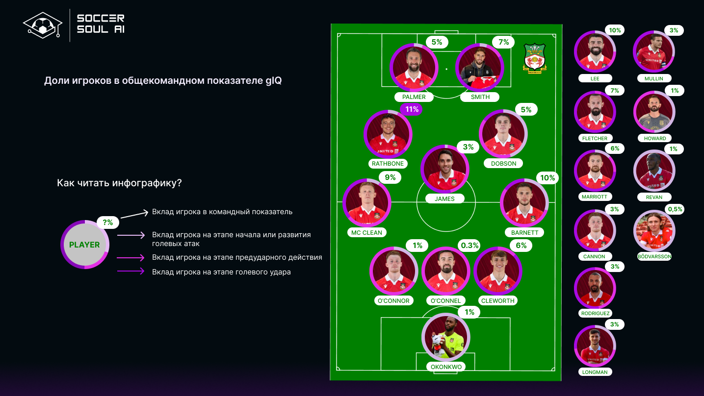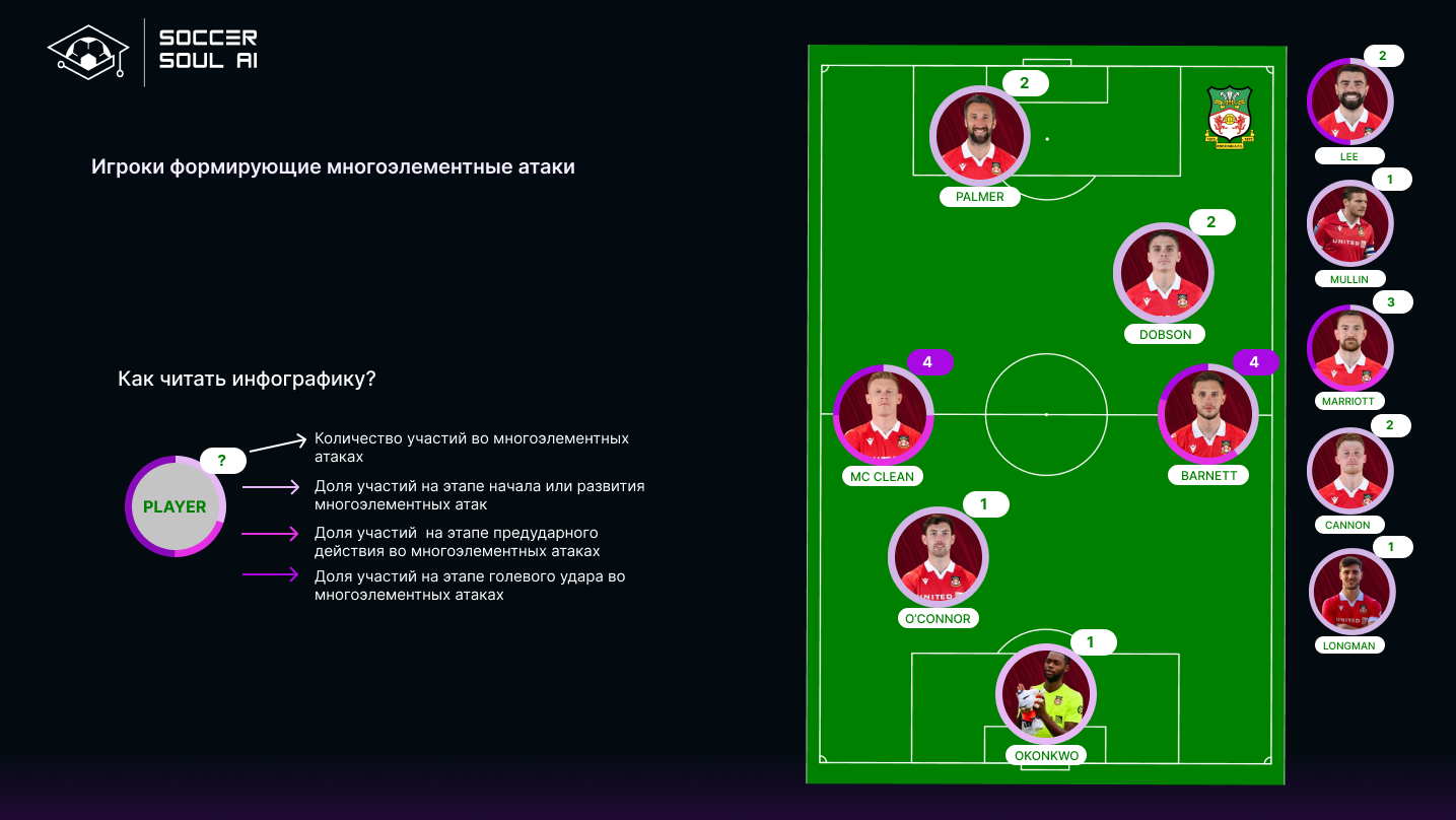 В составе Рексхэма 21 игрок за 46 матчей в той или иной степени совершал результативные действия. Речь не только о голевых передачах и ударах, но и ситуациях, формирующих голевую атаку, с условием их соответствия концепции активно-выгодной позиции.