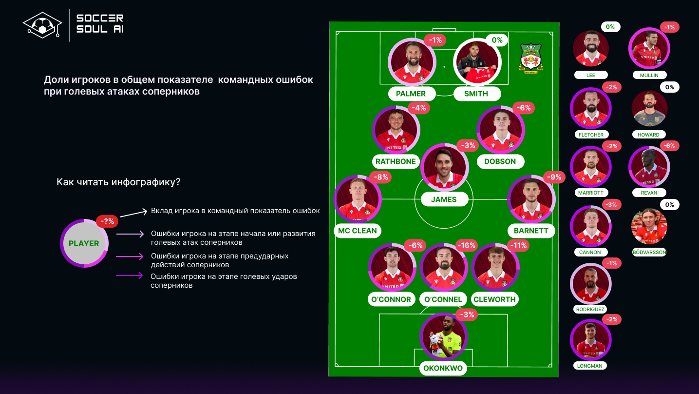 Разобраны все результативные игровые ситуации Рэксхема за 46 матчей сезона. Успешные действия игроков команды в атаках, завершившихся забитыми голами, шли в им в актив. Ошибки игроков в атаках, когда забивали соперники, пополняли пассив футболистов. Итоговое сочетание успешных и ошибочных решений отражает результативный баланс каждого футболиста.