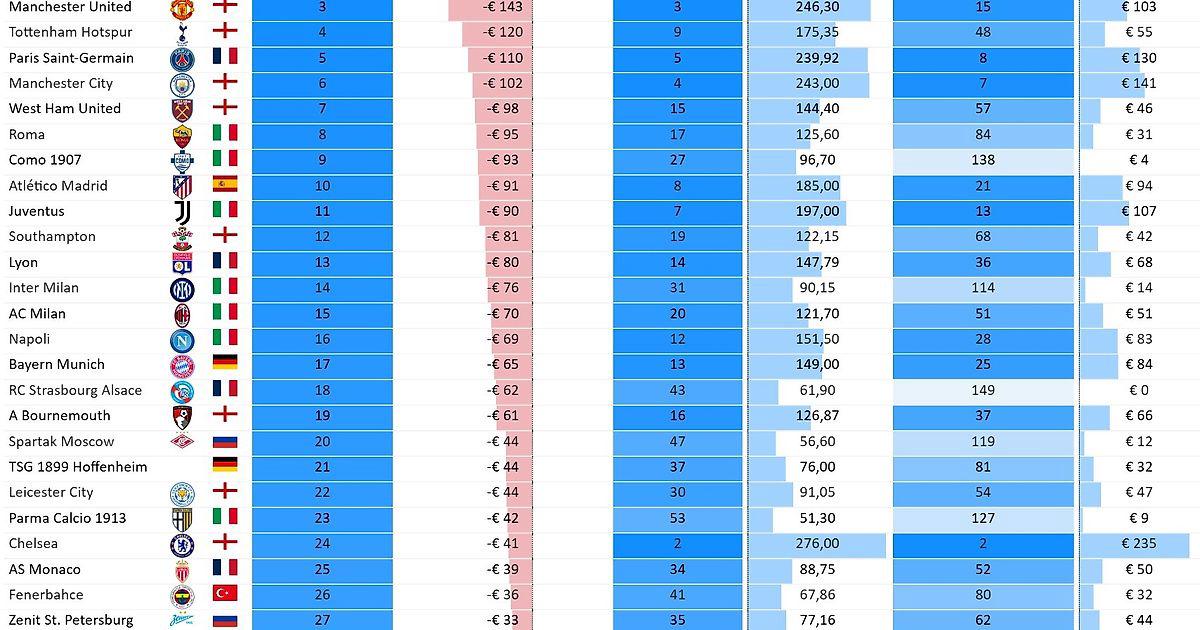 В топ-10 сразу девять клубов из Англии, к ним присоединился «ПСЖ». Если к любому представителю АПЛ в подобных рейтингах мы уже привыкли, то для кого-то может быть удивительно что на 17 месте «Парма» (и это после недавнего банкротства), а на 25 месте «Комо» (у клуба серьезные намерения и не просто закрепиться в Серии А). Сразу два российских клуба в топ-30: «Зенит» и «Спартак» по чистым расходам на трансферы разделяет «Реал Мадрид», а опережают итальянского чемпиона.