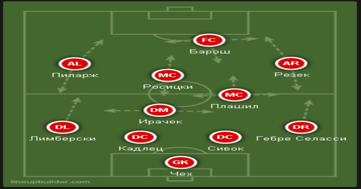 «Я бы сказал, что мы играем по схеме 4-2-3-1. Но самым важным является, то, как игроки смогут претворить планы на игру в жизнь. Преимуществом этой схемы является прежде всего то, что у команды появляется очень сильная линия полузащиты, а также то, что на флангах будут располагаться очень умелые и быстрые игроки, которые смогут поддержать Бароша в атаке», — говорит Билек.