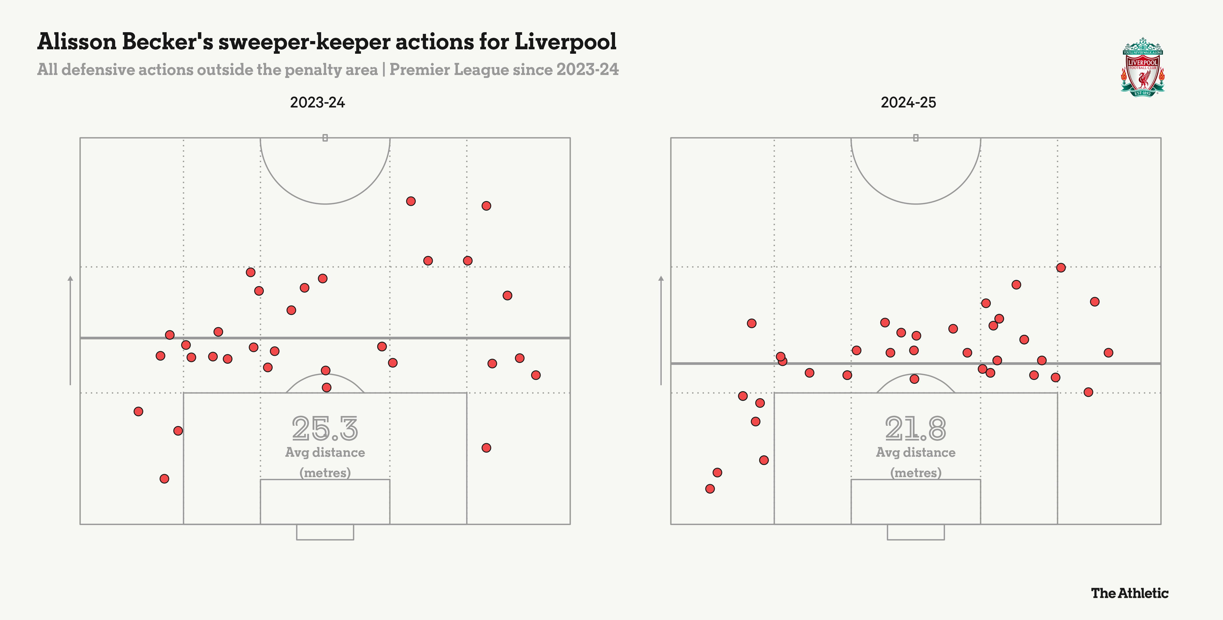 «Они получили то, чем редко пользовались при Клоппе: достаточное пространство, — говорит Мэтт Пиздровски, эксперт The Athletic по вратарям. — Благодаря большему количеству игроков, располагающихся за мячом, и большей дисциплине на поле, оборонительная фаза стала более предсказуемой, менее аварийной и более контролируемой».