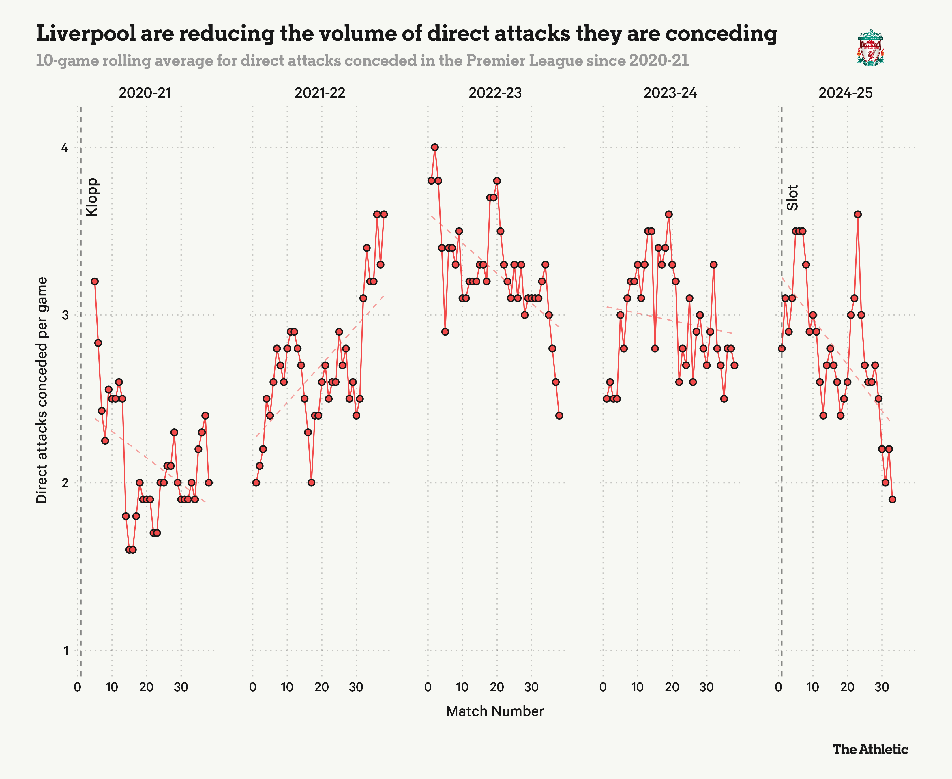 Способность контролировать переход соперника была тем элементом, который Слот отчаянно хотел исправить, когда прибыл прошлым летом. В последнем сезоне Клоппа «Ливерпуль» часто противостоял контратакам, но если посмотреть на количество пропущенных прямых атак — как показатель контратакующей игры — в среднем за 10 игр, то можно увидеть, насколько оно заметно сократилось в этом сезоне при Слоте по сравнению с предыдущими кампаниями.