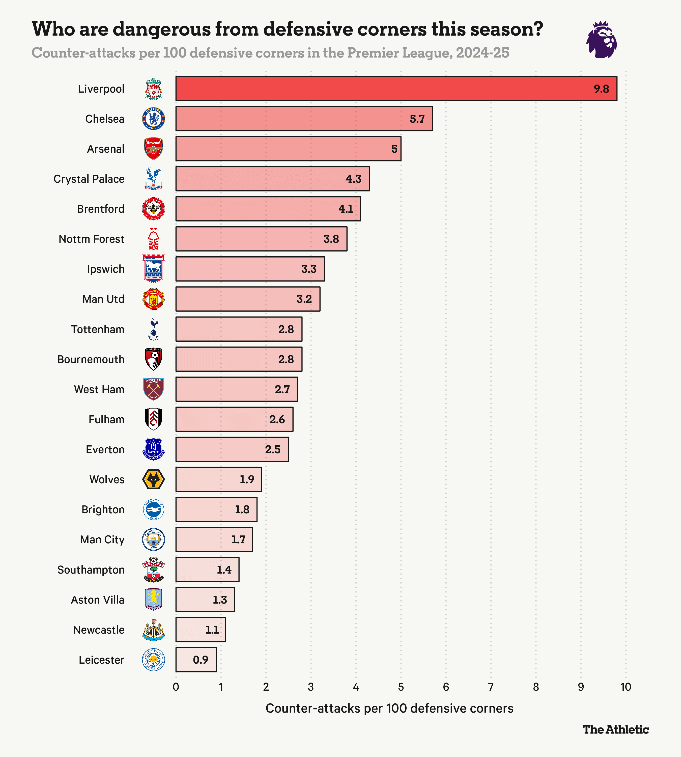 Масштаб угрозы со стороны «Ливерпуля» становится еще более очевидным благодаря цифрам. Как недавно проанализировал Ахмед Валид, количество их контратак на 100 угловых в обороне было самым высоким в Премьер-лиге за первые 34 матча этого сезона — почти вдвое больше, чем у ближайшего конкурента.