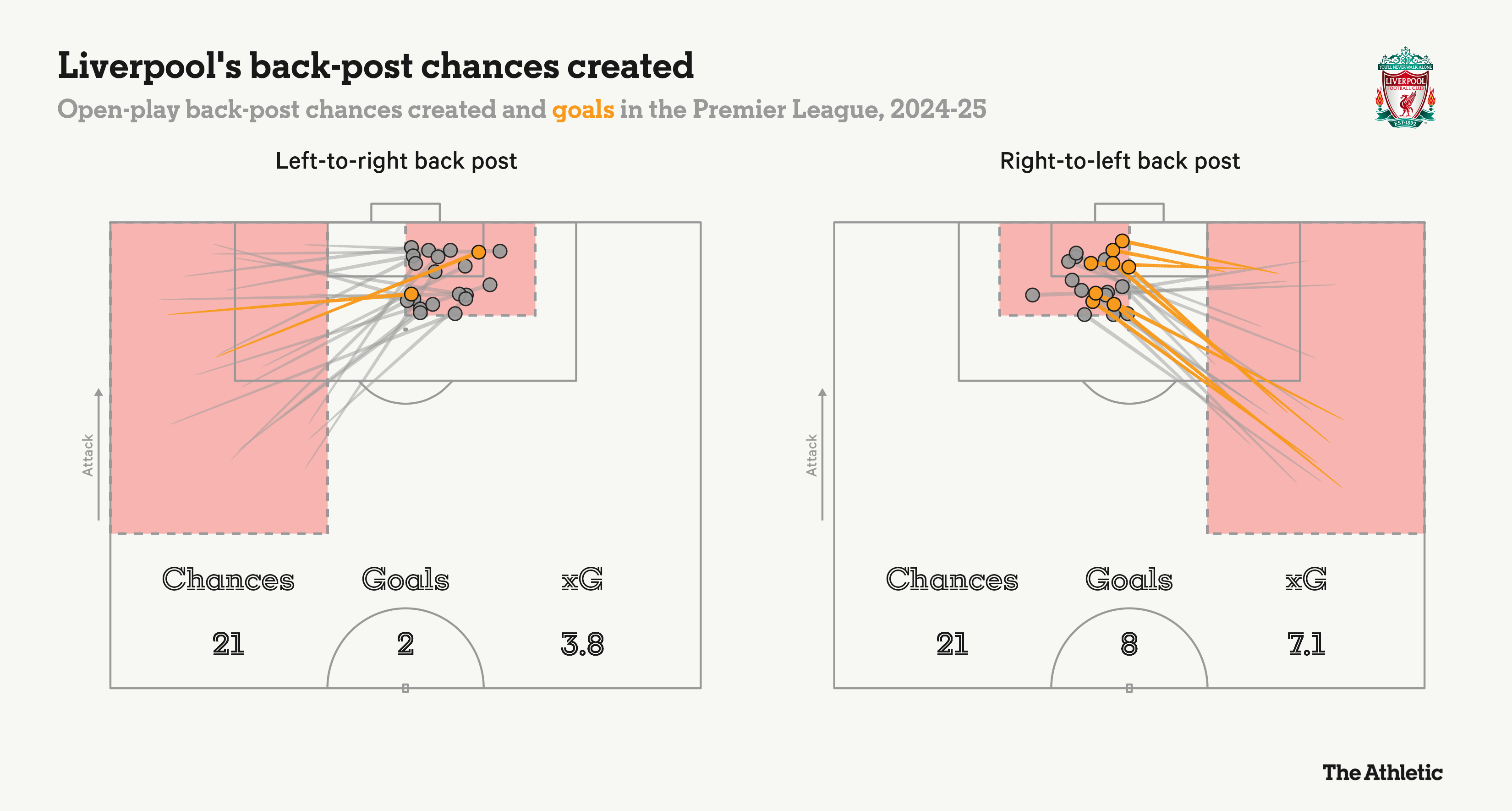 В этом сезоне ни одна команда Премьер-лиги не создавала больше моментов на дальней штанге, чем «Ливерпуль» — в общей сложности 11 ожидаемых голов.