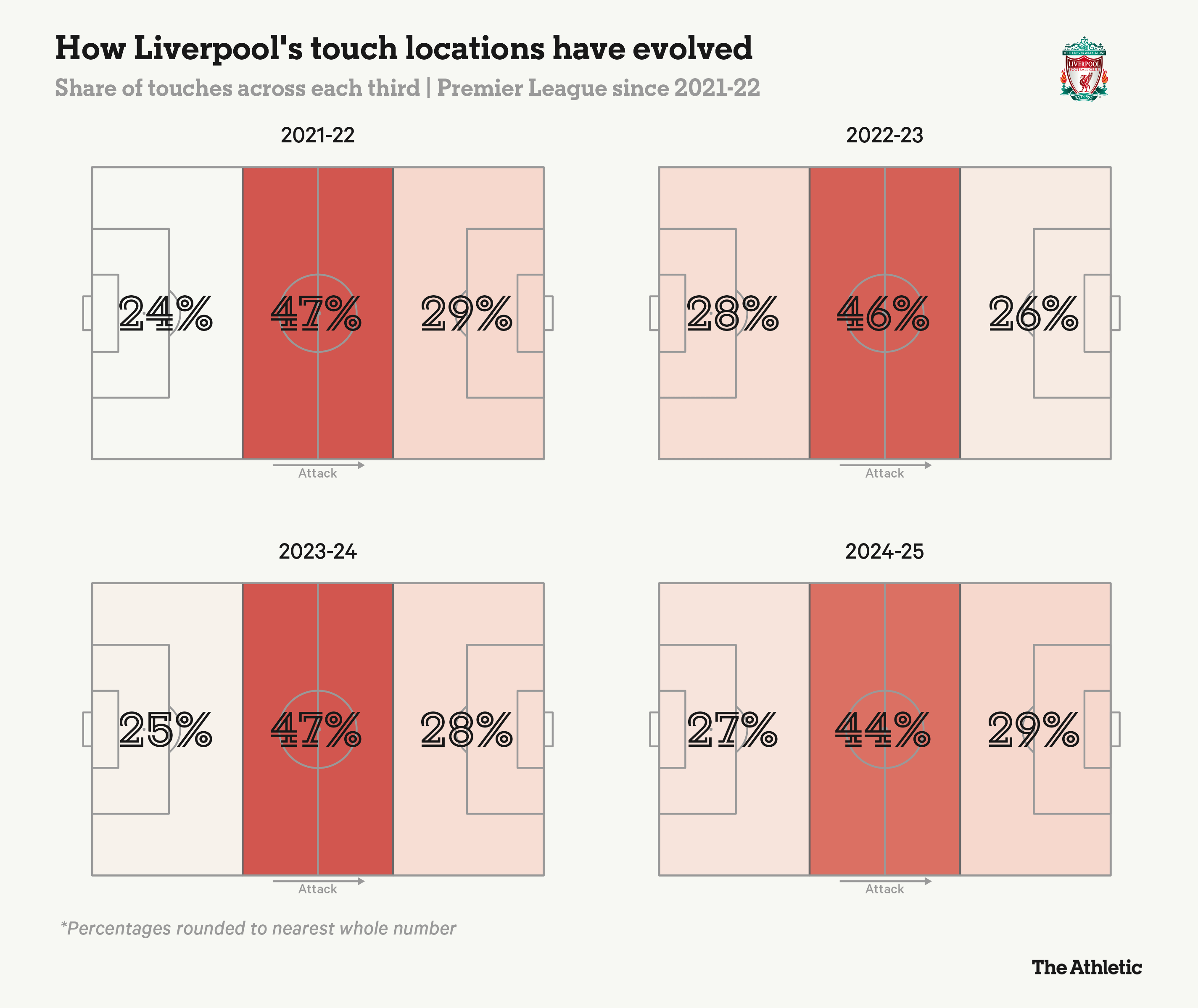 Итак, если говорить о 34 матчах, которые принесли «Ливерпулю» чемпионский титул, то на графике ниже видно, что по сравнению с предыдущими сезонами «Ливерпуль» стал более сбалансированным в касаниях в каждой трети поля — они могут создавать атаки в глубине поля, передавать мяч по центру или доминировать на территории в зависимости от требований.