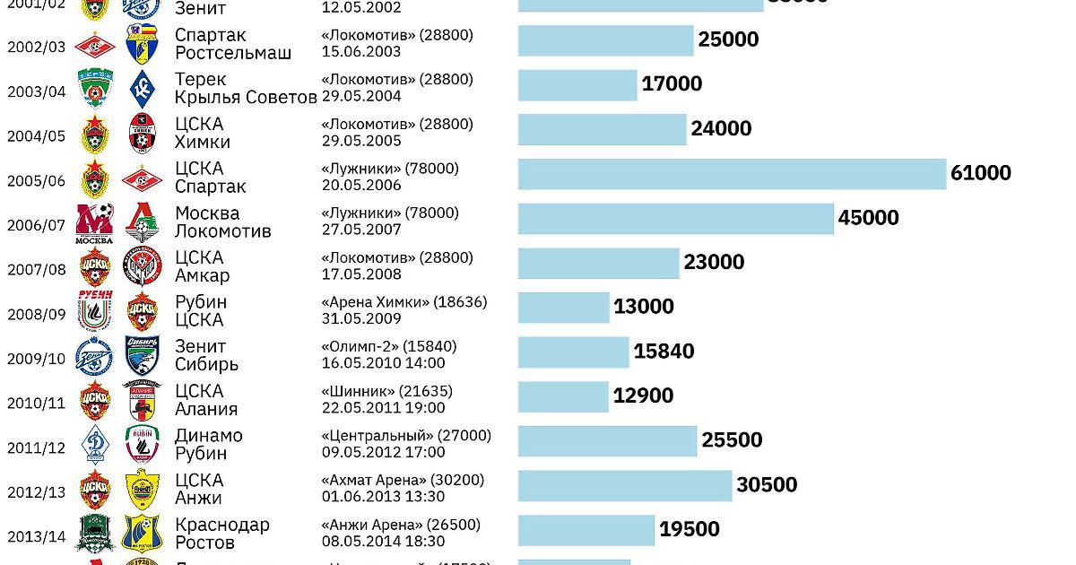 Напомню, посещаемость всех матчей всех российских турниров можно оперативно смотреть в канале «Футбольная посещаемость». А ниже — ретроспектива всех финалов в истории Кубка.
