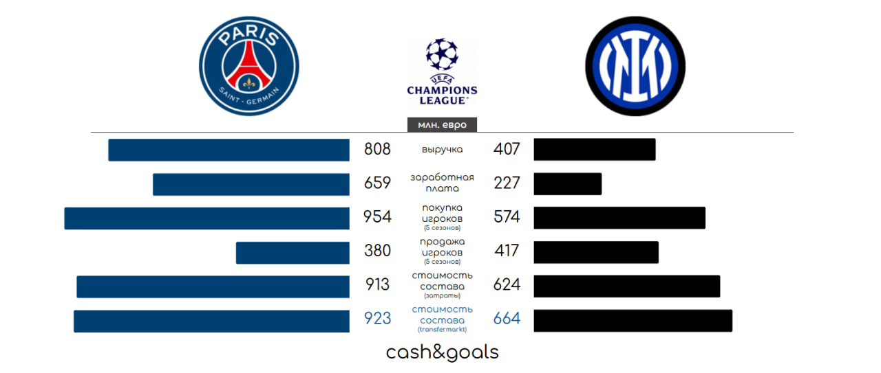 Ну и вернемся к финалу Лиги чемпионов. Обзор финансов Интера на фоне чемпионского Наполи можно найти в предыдущем материале cash&goals. Здесь же оставлю небольшое графическое сравнение финансовых возможностей финалистов.