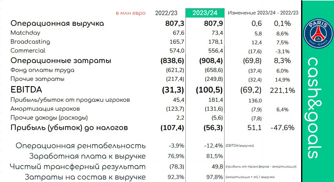 В отчете же можно увидеть рекордную прибыль от трансферов - 181 млн (помогли крупные продажи арабским клубам, в т.ч. трансферы Неймара и Верратти). Она позволила перекрыть сумму амортизации (131,6 млн) и получить положительный чистый трансферный результат (49,8 млн), который уменьшил сумму убытка до относительно приличных 56,3 млн. Но это 5-й убыточный сезон подряд, а совокупный убыток с 2020 года составил 889 млн.
