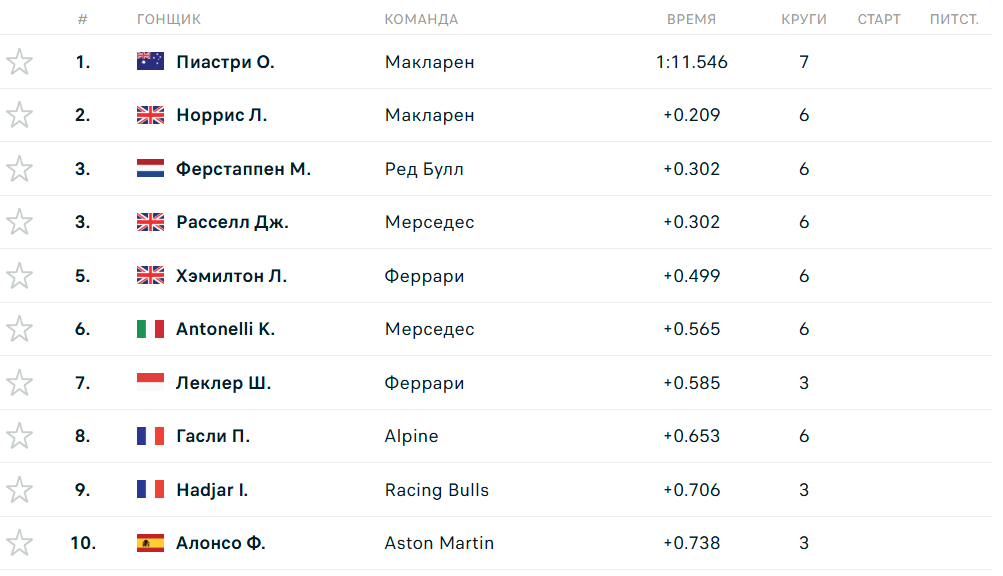 В итоге Пиастри с лучшим временем уикенда — 1:12:387, за ним Норрис — 0.526 и Леклер — 0.743.