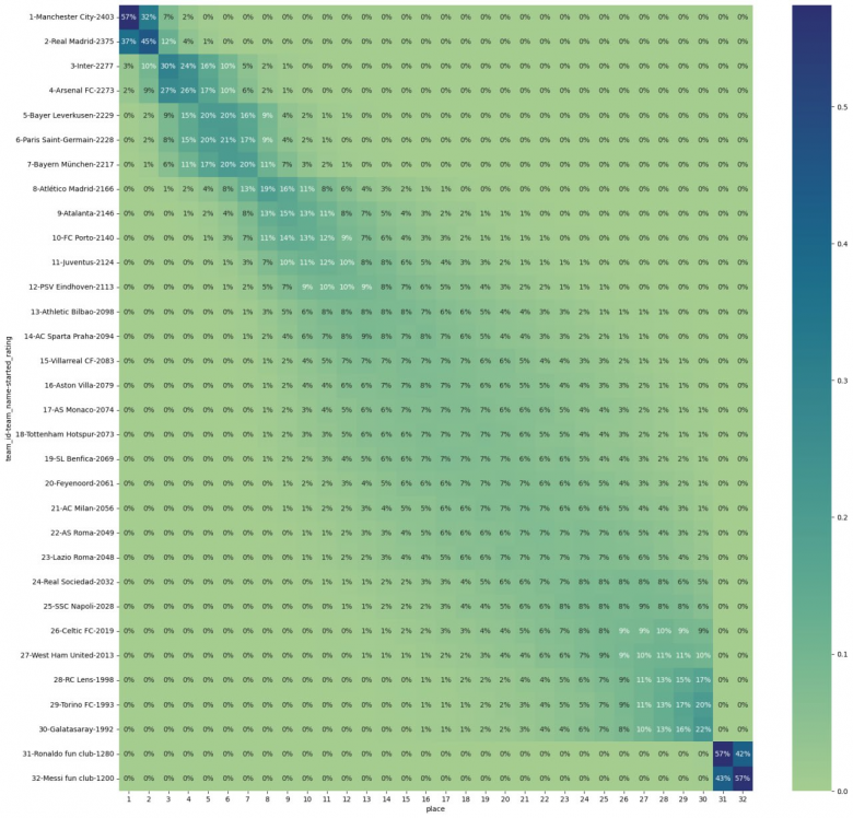 Тепловая карта, которая показывает вероятность команды занять то или иное место. Пример для кругового турнира. Выборка на 100 симуляциях.