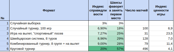 Другие форматы больше чем в два раза лучше, чем просто случайный набор матчей. А вот разница форматов между собой не такая уж и большая. Например, добавление группового этапа улучшает меру справедливости по сравнению с обычной игрой на вылет всего на 24%.