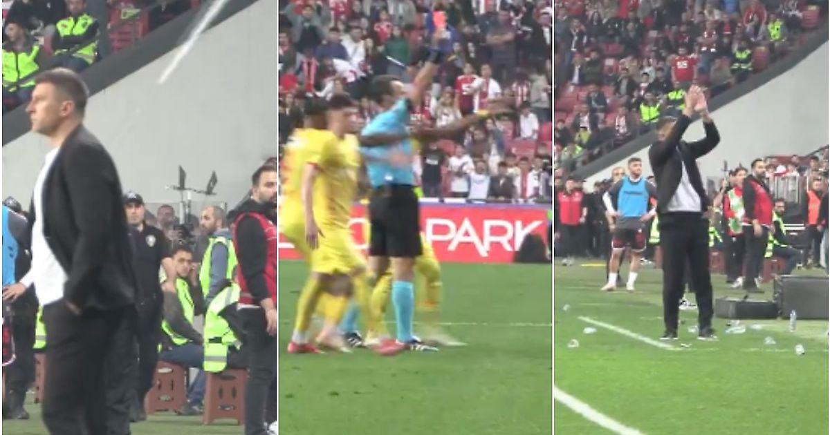 😯 Футбол по-турецки: тренеру «Кайсериспора» Якировичу прилетел с трибун стакан в плечо – а потом еще и красная карточка 😡