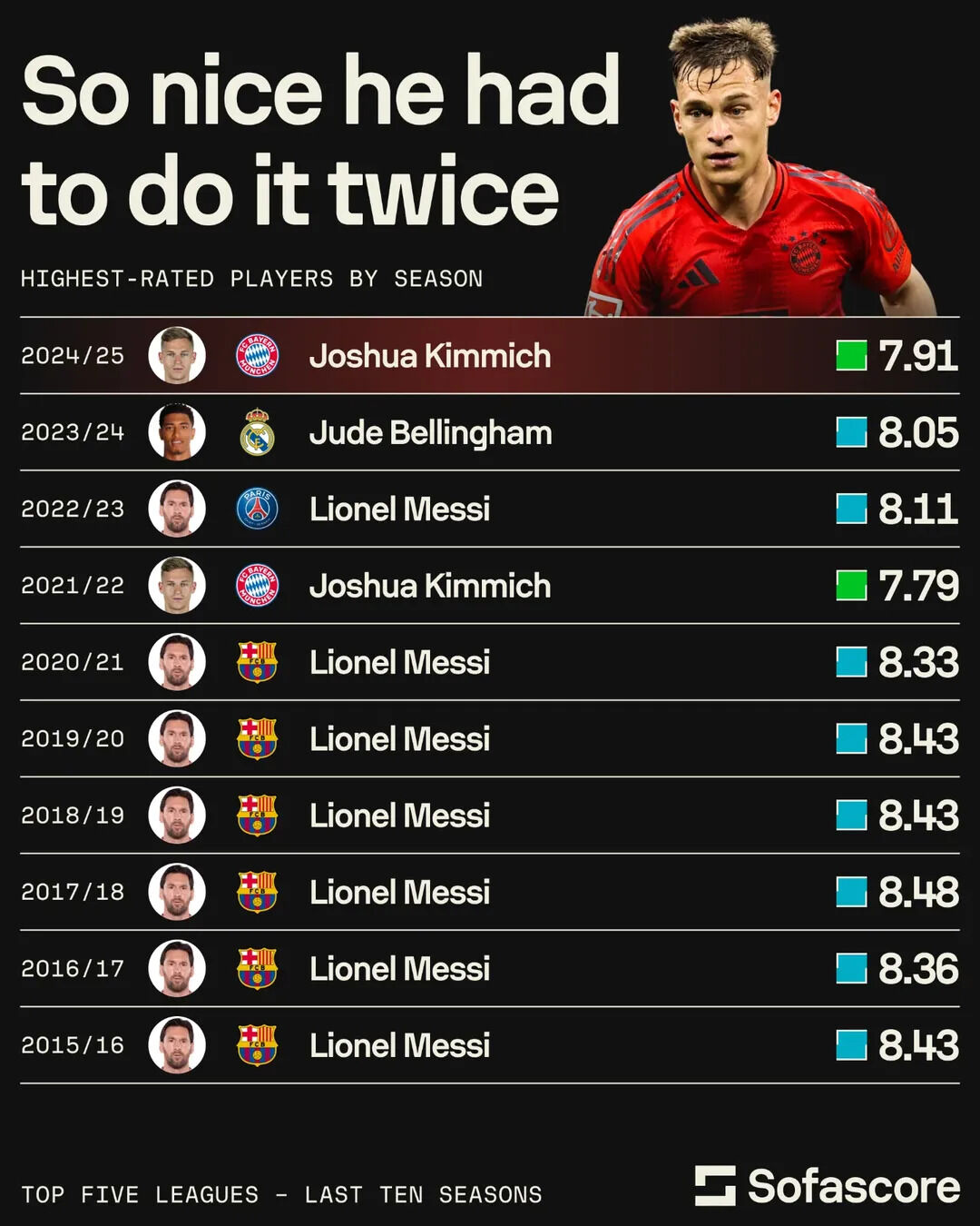 Да, если верить среднему рейтингу футболистов по сезону, который ведет Sofascore, то сильнейшим игроком был хавбек «Баварии» Йозуа Киммих.
