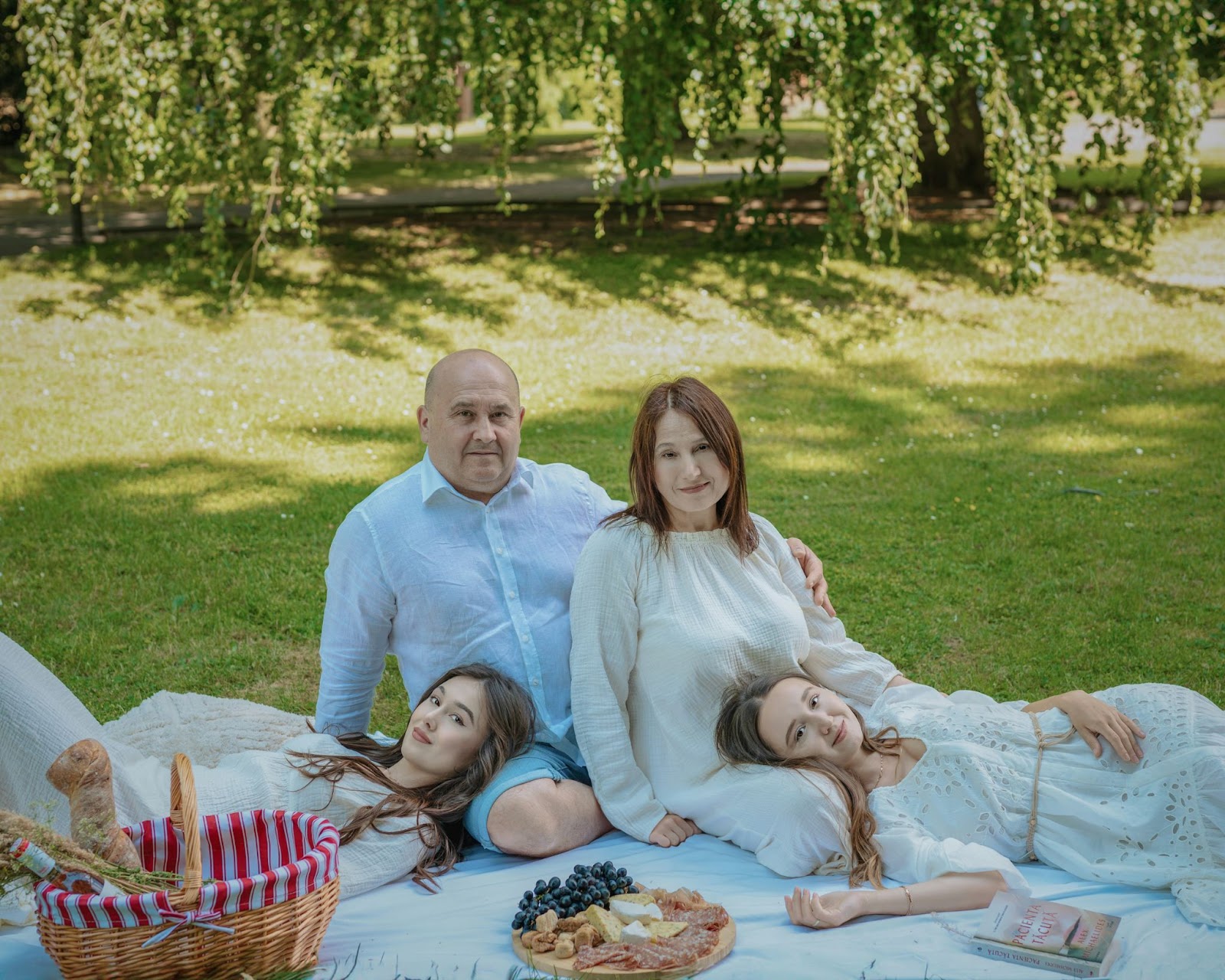 Семья в пастельных тонах на уютном пикнике в парке – минимализм, который подчеркивает искреннее тепло и близость. На пледе – корзина и фрукты, создающие атмосферу спокойствия и гармонии. Подобная съемка – идеальный способ запечатлеть естественную любовь и легкость семейных отношений без лишних деталей.