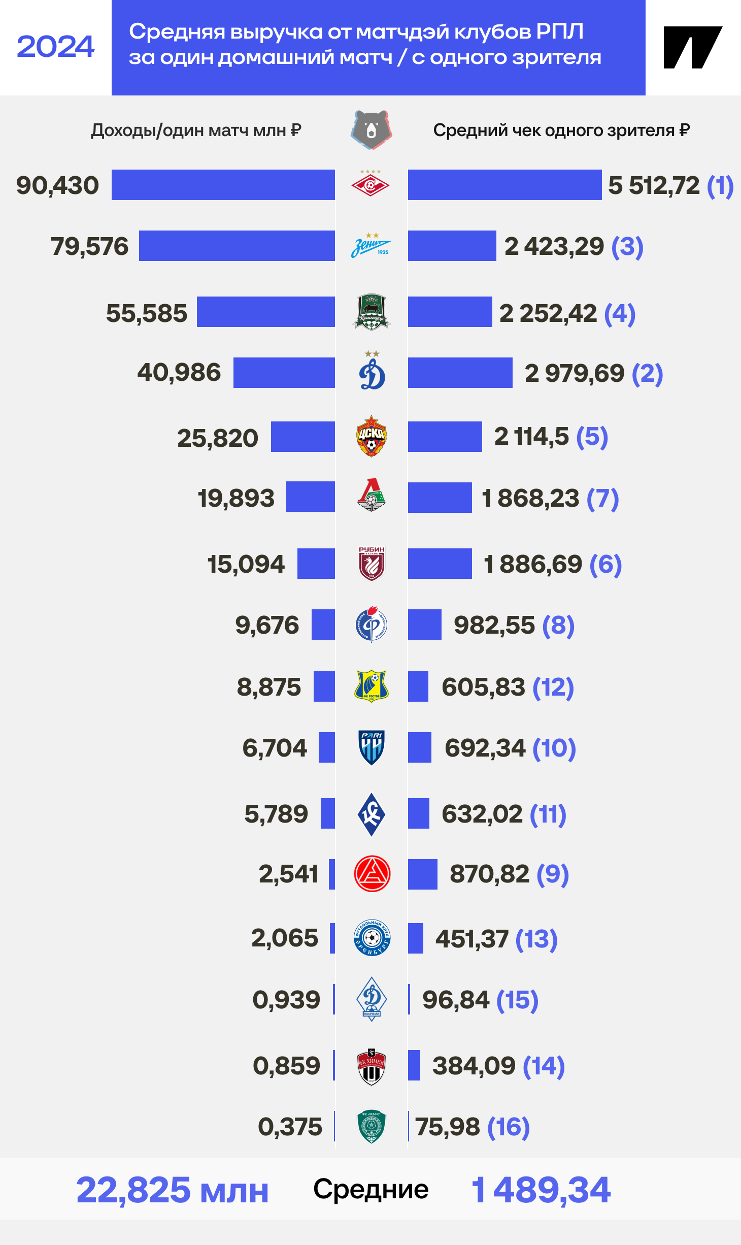 Из расчета на одного зрителя «Спартак» с 61 евро за матч делит 12-е место с «Ман Сити», обгоняя в расточительности фанов «Ньюкасл», «Интер» и «Атлетико». «Динамо» в начале пятого десятка на уровне «Наполи» (33 евро), но выше «Бенфики», «Лацио» и дортмундской «Боруссии».