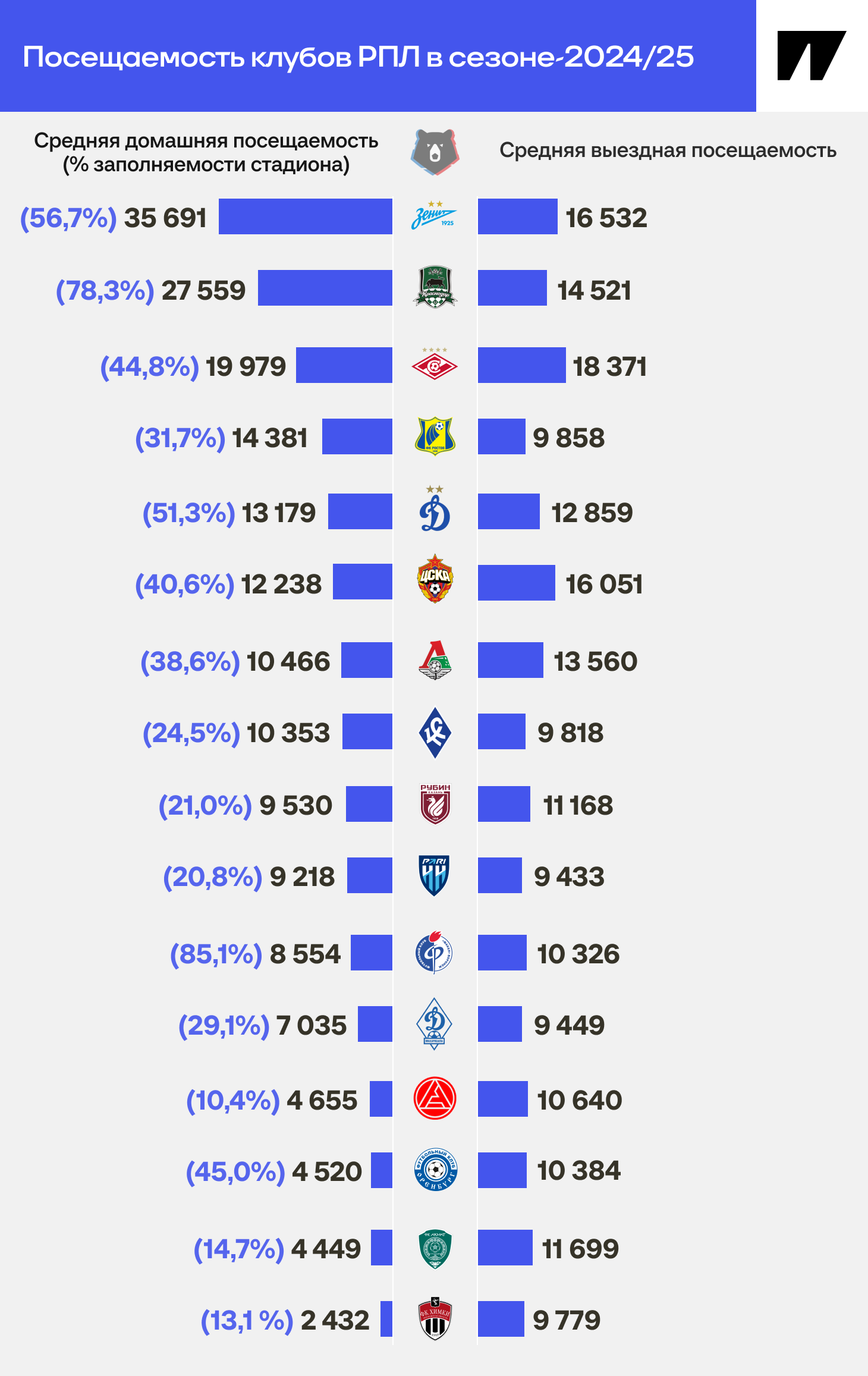 ● На выезде, ожидаемо, чаще всего ходят на топов – «Спартак», «Зенит» и ЦСКА. Выездная посещаемость «Химок» была в четыре раза выше домашней.