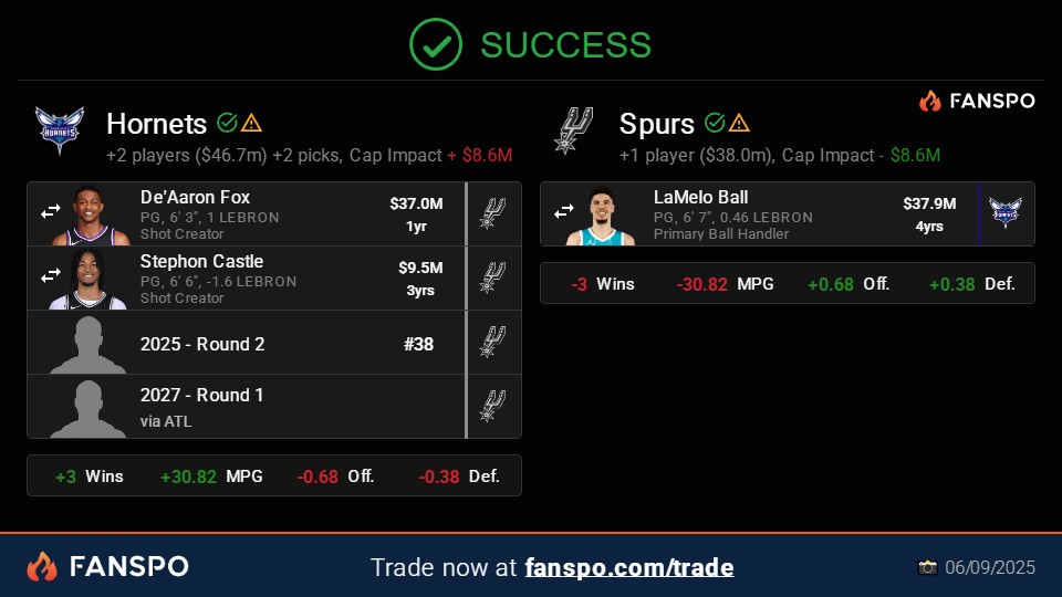 Данный вариант – что-то из разряда фантастики, но в НБА возможно всё! Сейчас более подходящего партнера для Виктора Вембаньямы на рынке, кроме как Ламело Болл – нет. Даже несмотря на маленький рынок, «Сан-Антонио» сейчас находятся на пороге становления командой-контендером, а добавления такого игрока как Ламело в их состав – поможет в ускорении данного процесса. Ламело получит партнера, который в одиночку может закрыть его слабую игру в обороне, а в атаке даже подумать страшно, на что способен такой дуэт. «Сан-Антонио» обладают достаточным количеством активов, чтобы заинтересовать «Шарлотт», но тут, думаю, основным фактором является желание самого Ламело. Захочет ли игрок переезжать в другой маленький и не медийный город, но к идеальному партнеру, или же большой рынок – главный фактор для него?