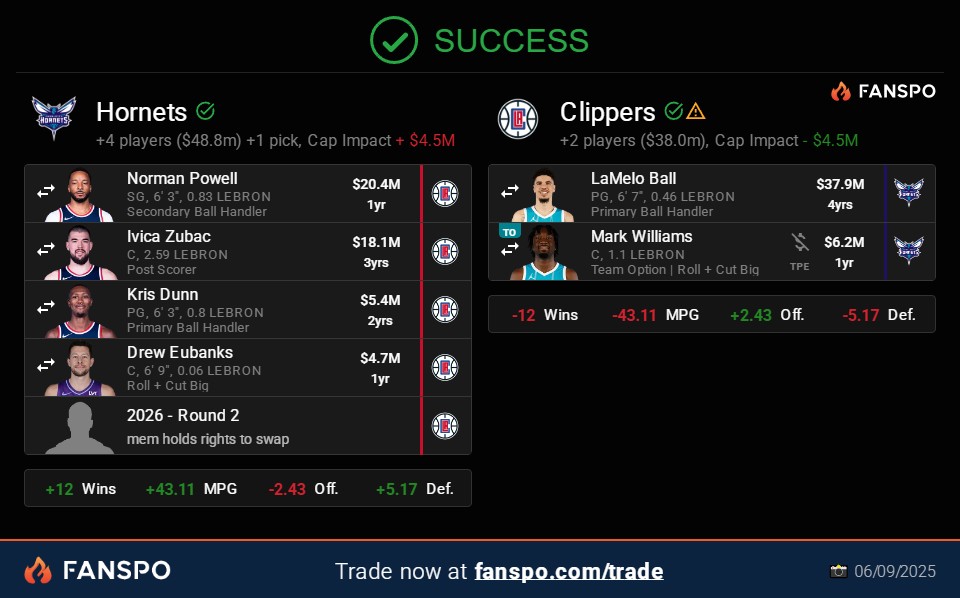 Сейчас именно с «Клипперс» связывают будущее Ламело. Как мне кажется, данный обмен может быть интересен игроку, но тут стоит принять во внимание факт: если ради сделки придётся разобрать полкоманды – риск провала достаточно велик. Конечно, Лос-Анджелес – это лучшее место для жизни и продолжения карьеры игрока, который несколько лет был суперзвездой в команде без побед. С другой стороны, если «Клипперс» удастся сохранить Кавая Леонарда, и добавить к нему Ламело, то мы сможем получить уникальный дуэт, где игроки гармонично дополнять друг друга на площадке. Самое главное, что у «Клипперс» есть активы, которые они смогут предложить «Шарлотт Хорнетс».