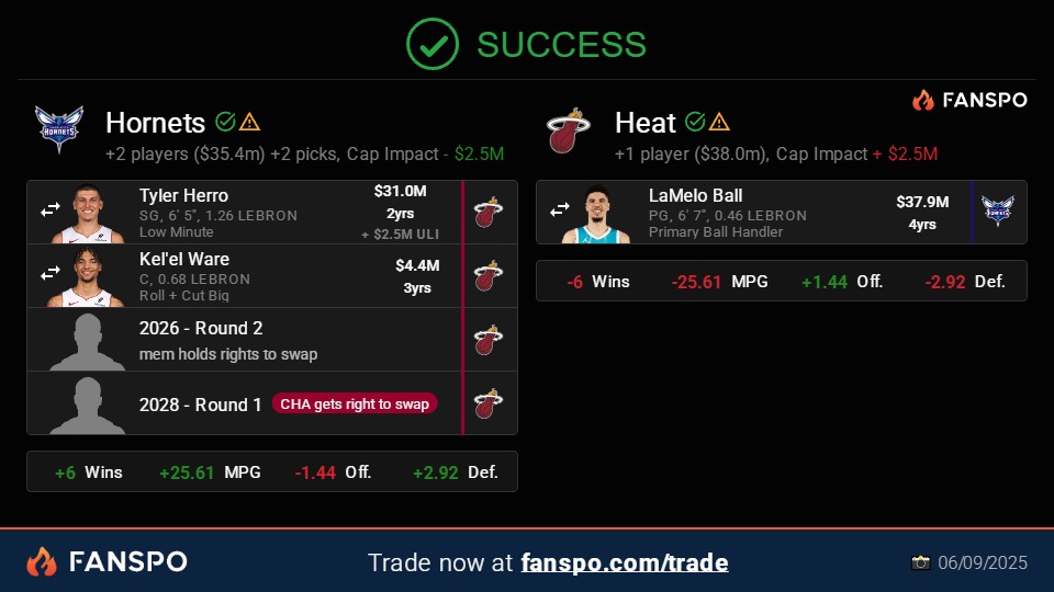 После ухода Джимми Батлера, «Майями» остались без первой звезды. Потенциальный переход Ламело может стать «win-win-win» для всех сторон. В первую очередь, Болл получает партнеров другого уровня, способных скрыть его недостатки в защите и разгрузить в нападении, что для игрока такого типажа очень важно. Ламело – прекрасный разыгрывающий с чувством паса и атакующей мощью, но бесполезный в защите. Для «Майями» такой персонаж станет очень важным с точки зрения маркетинга. Более того, команда получит игрока, который сможет закрыть вопрос первой звезды и мозга команды в нападении. «Шарлотт» смогут выручить за Ламело хорошие активы (например: Эндрю Уиггинса или Тайлера Хирро), которых можно будет обменять на драфт-пики и уйти в очередную перестройку вокруг второй звезды команды – Брендона Миллера.