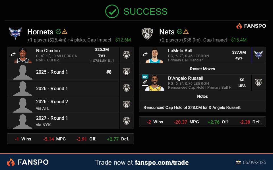 Сложность данной сделки может заключаться в том, что у Бруклина может не быть достойного предложения для обмена Ламело. На нынешний ростер команды без слез не взглянешь, но наличие пиков на драфте может стать ключевым фактором в потенциальной сделке. Данный трейд менее вероятен, чем первый вариант, но для менеджмента «Бруклина» данная задача может стать отличным кейсом для улучшения их резюме.