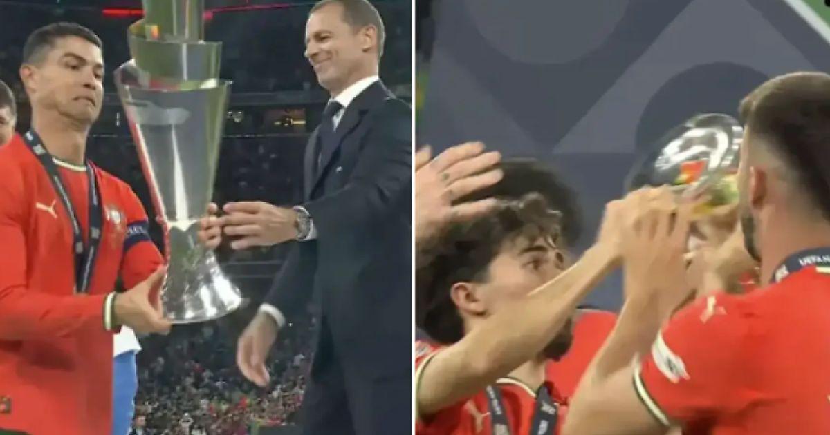 После вручения трофея Криштиану Роналду едва не оказался в неловкой ситуации — его выражение лица при получении кубка от Александера Чеферина уже разлетелось по соцсетям. Еще чуть-чуть — и кубок упал бы.