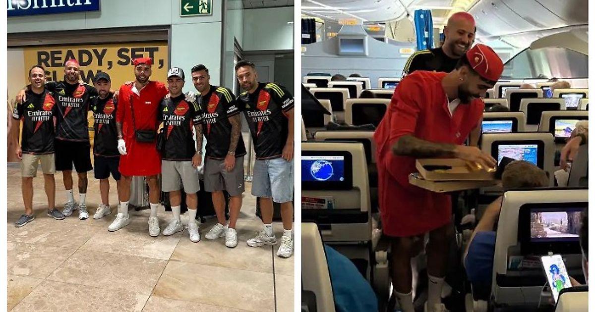 Курицу или рыбу? Голкипер «Арсенала» в костюме стюардессы повез друзей на мальчишник