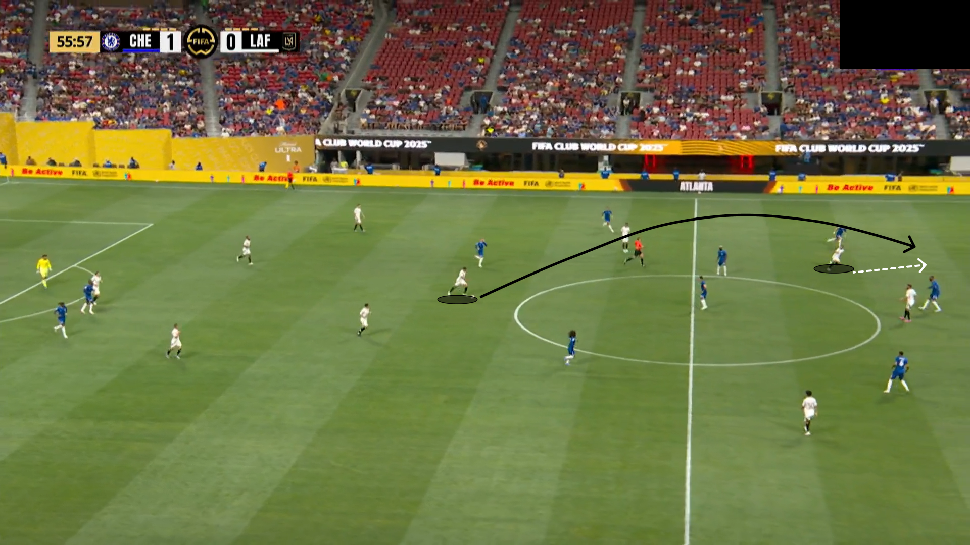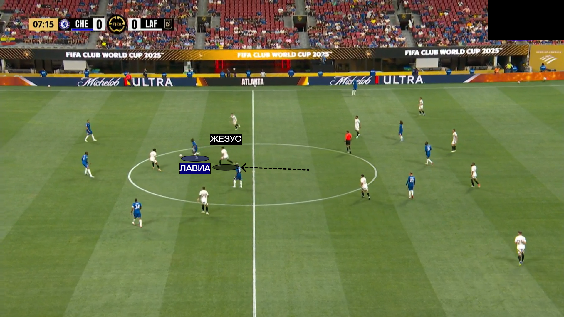 «Лос-Анджелес» пытался держать компактность не только в центре поля. Например, при получении мяча в полуфланге, ближайшие адресаты в синей форме были перекрыты, или оказывались под давлением. Иной функционал был у форварда: игрок должен был опускаться ниже и перекрывать сразу две возможные передачи – на центрального защитника или второго опорника. Сильное давление на один участок поля создавало разрывы на другом, плюс полупозиция форварда давала Челси» возможность грамотно развернуть атаку и выйти из-под давления.