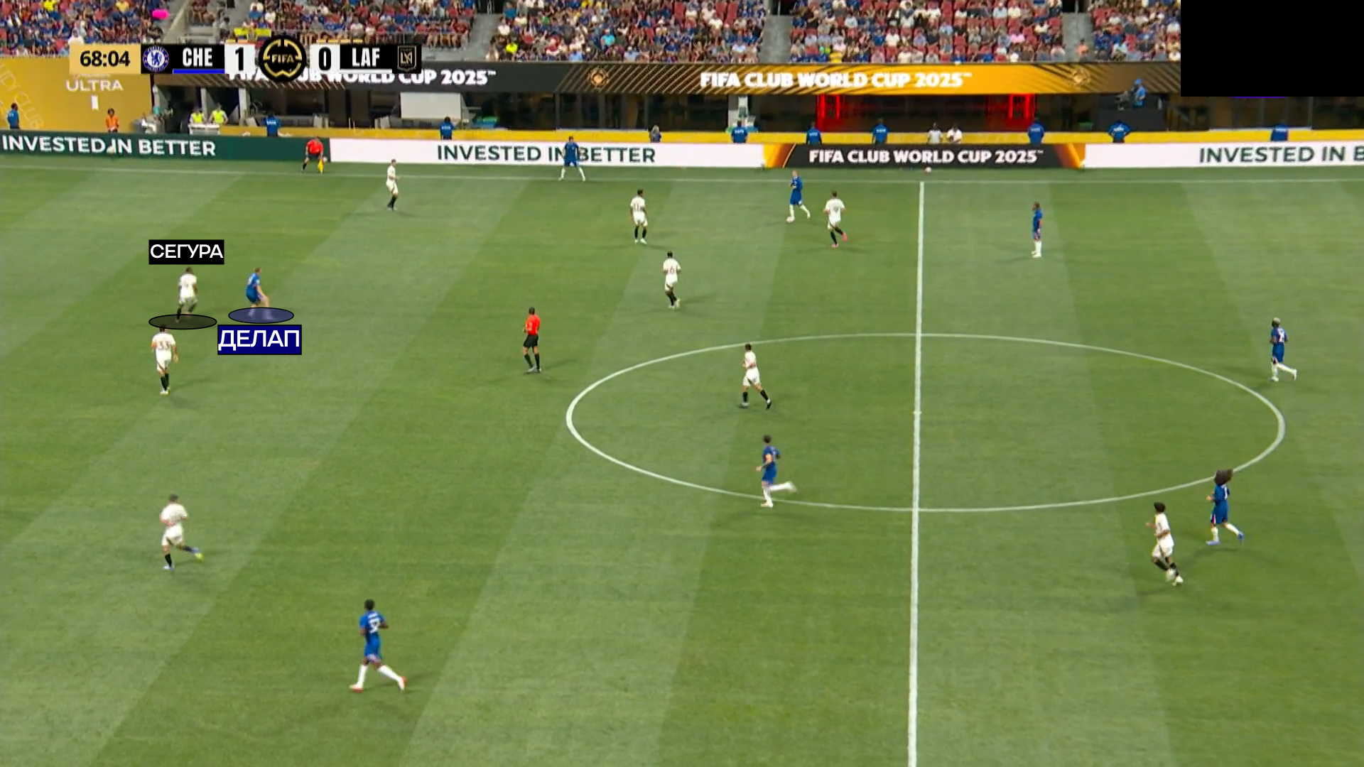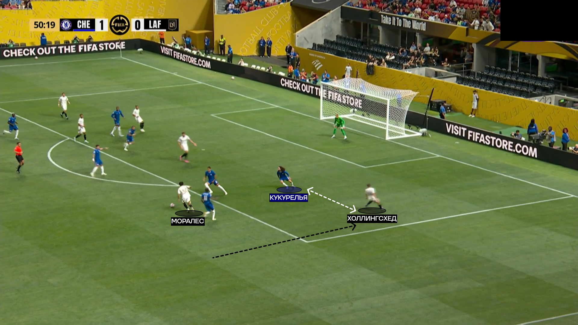 «Лос-Анджелес» грамотно пользовался переходной стадией из атаки в оборону, раз за разом отдавая длинный пас на ход вингерам. Пару раз «Челси» везло, что игроки «ЛА» не реализовывали моменты. Эпизод ниже закончится опасным ударом и сейвом Роберта Санчеса.