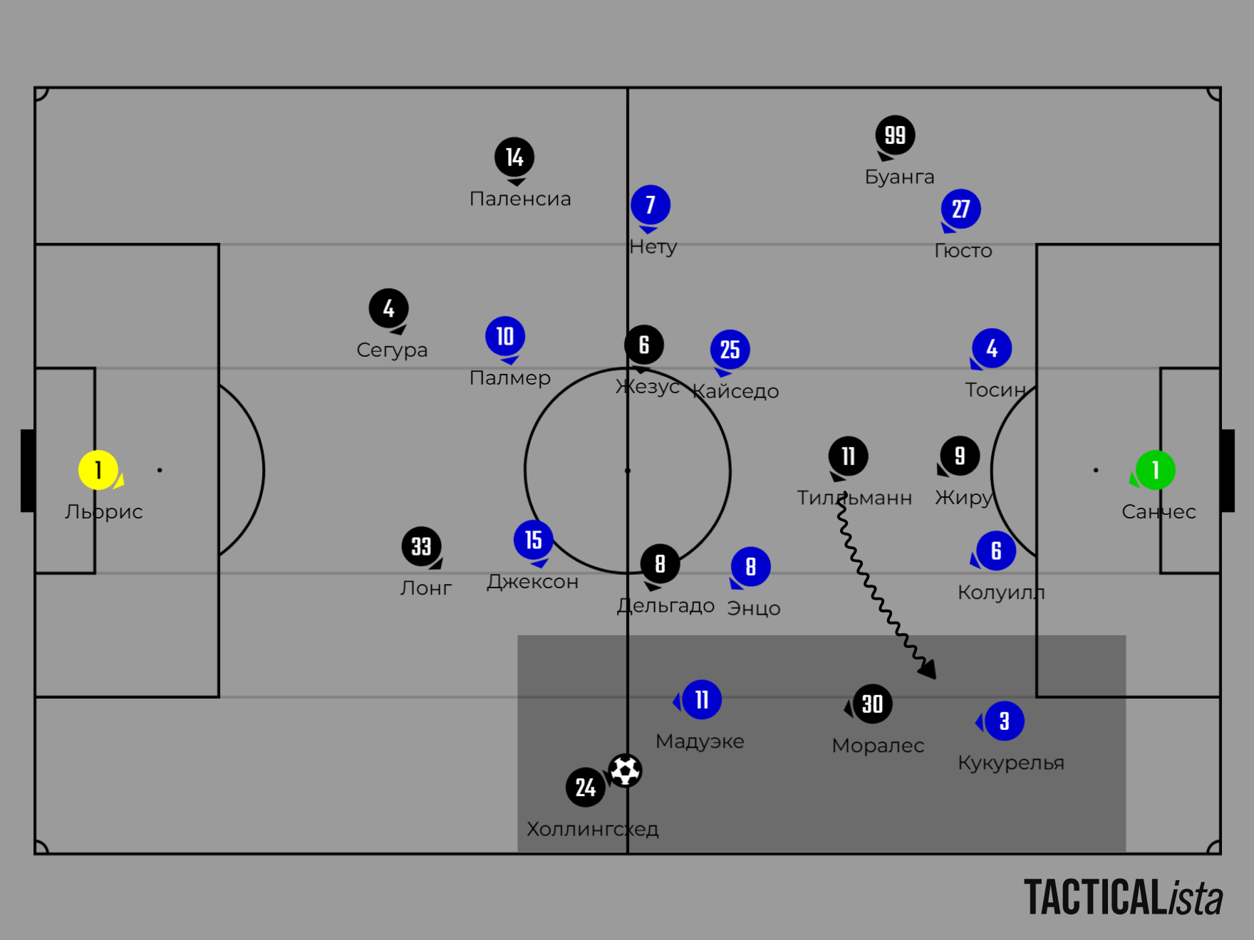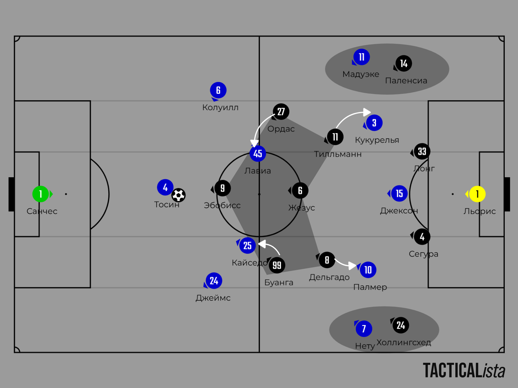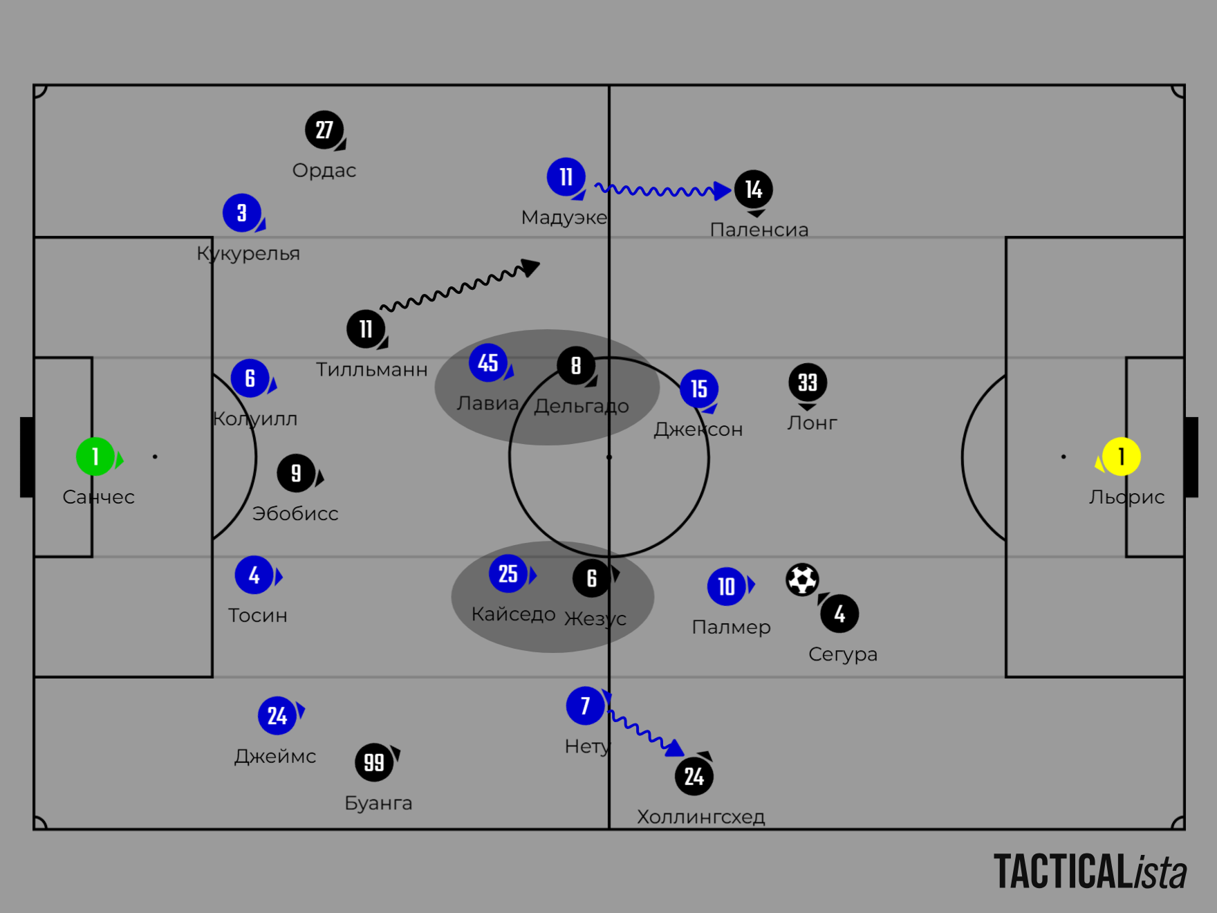 «Челси» же защищался в схеме «4-4-2», с особой ролью вингеров. Нету и Мадуэке играли по фуллбекам Холлингсхеду и Паленсии, не давая им уйти выше в атаку. В начале атак помогал Тилльман, опускаясь ниже, распыляя внимание Мадуэке сразу на двух игроках.