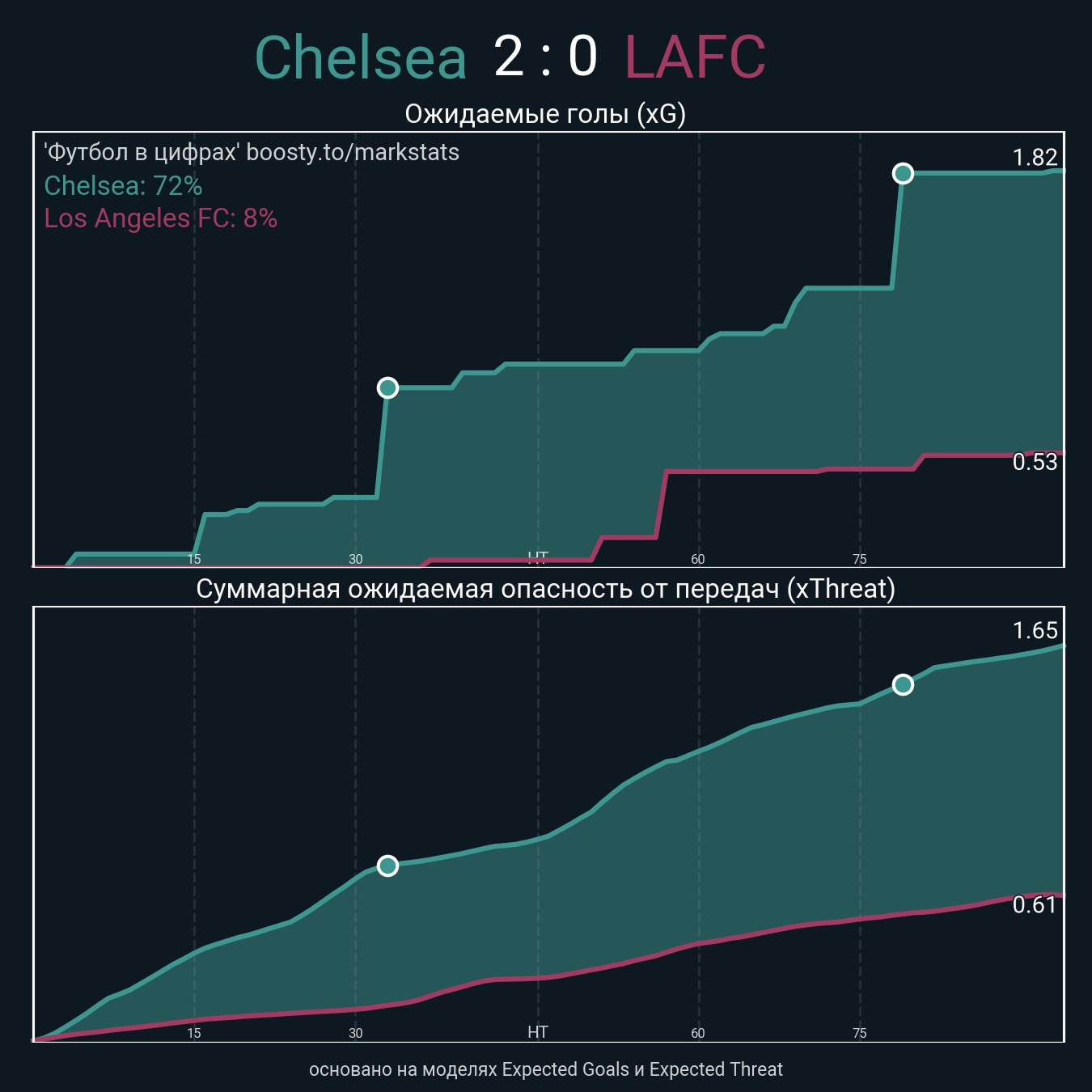 Если обратить внимание на график xG, то явно бросится в глаза тот факт, что «Челси» стал получать явную угрозу воротам именно во втором тайме.
