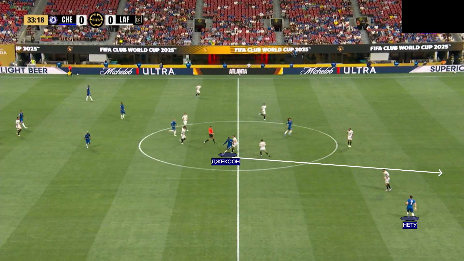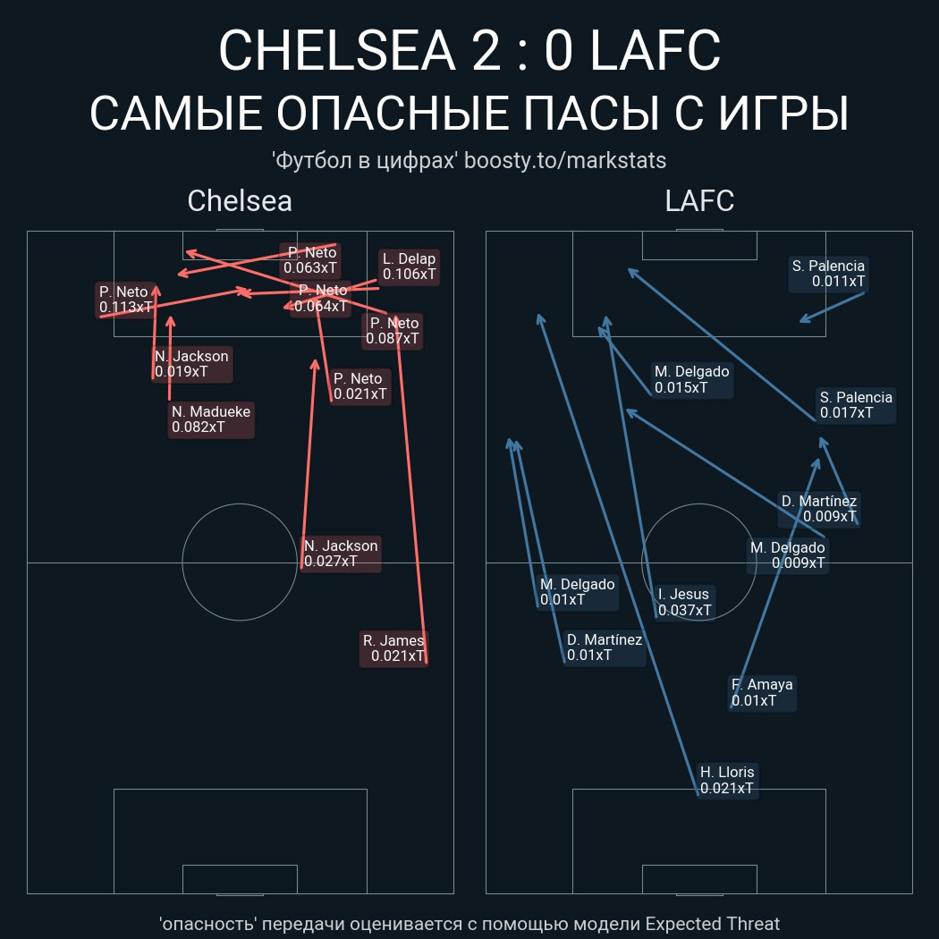 Также, «Челси» использовал длинные передачи как способ выйти из-под прессинга соперника. Помогали перебросы мяча с фланга на фланг – из-за тактических соображений, крайние защитники «ЛА» часто оставались в ситуации 1 в 1 против вингеров «Челси». Большую выгоду из этого получил Нету – у португальца 5 из 7 успешных обводок. Мадуэке в том аспекте был менее ярок – 1 из 3.
