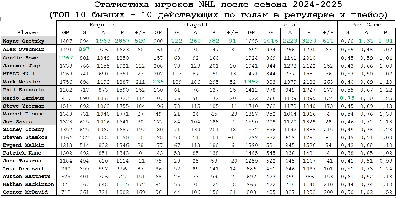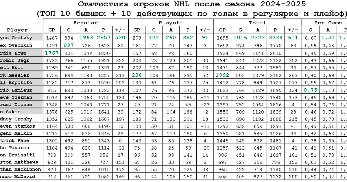 У Саши Овечкина впереди еще один сезон в НХЛ, чтобы попытаться превзойти Гретцки и по общему числу голов в регулярке и плеоф. Будет не просто.