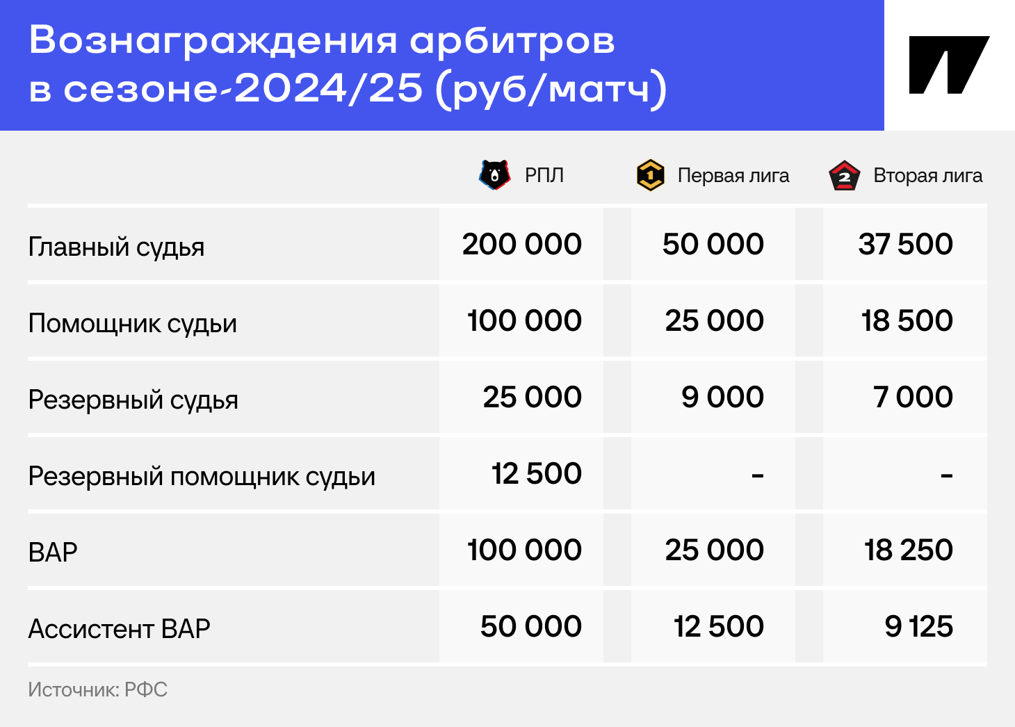 Вознаграждения арбитром устанавливает РФС в зависимости от уровня матчей.