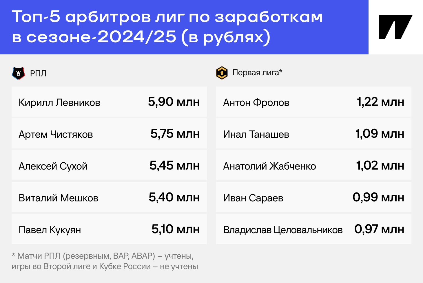 Неплохо зарабатывают арбитры, специализирующиеся на ВАР: например, Андрей Фисенко провел главным всего четыре матча в Первой лиге, но за счет работы в РПЛ видеоассистентом (в общей сложности 42 матча ВАР/АВАР) заработал 3,5 млн рублей. У Артура Федорова три матча главным в Первой лиге, но 38 в РПЛ как ВАР/АВАР. Иногда арбитры получали сразу по два назначения видеоассистентом (помощником) в одном туре РПЛ (например, в 29-м).