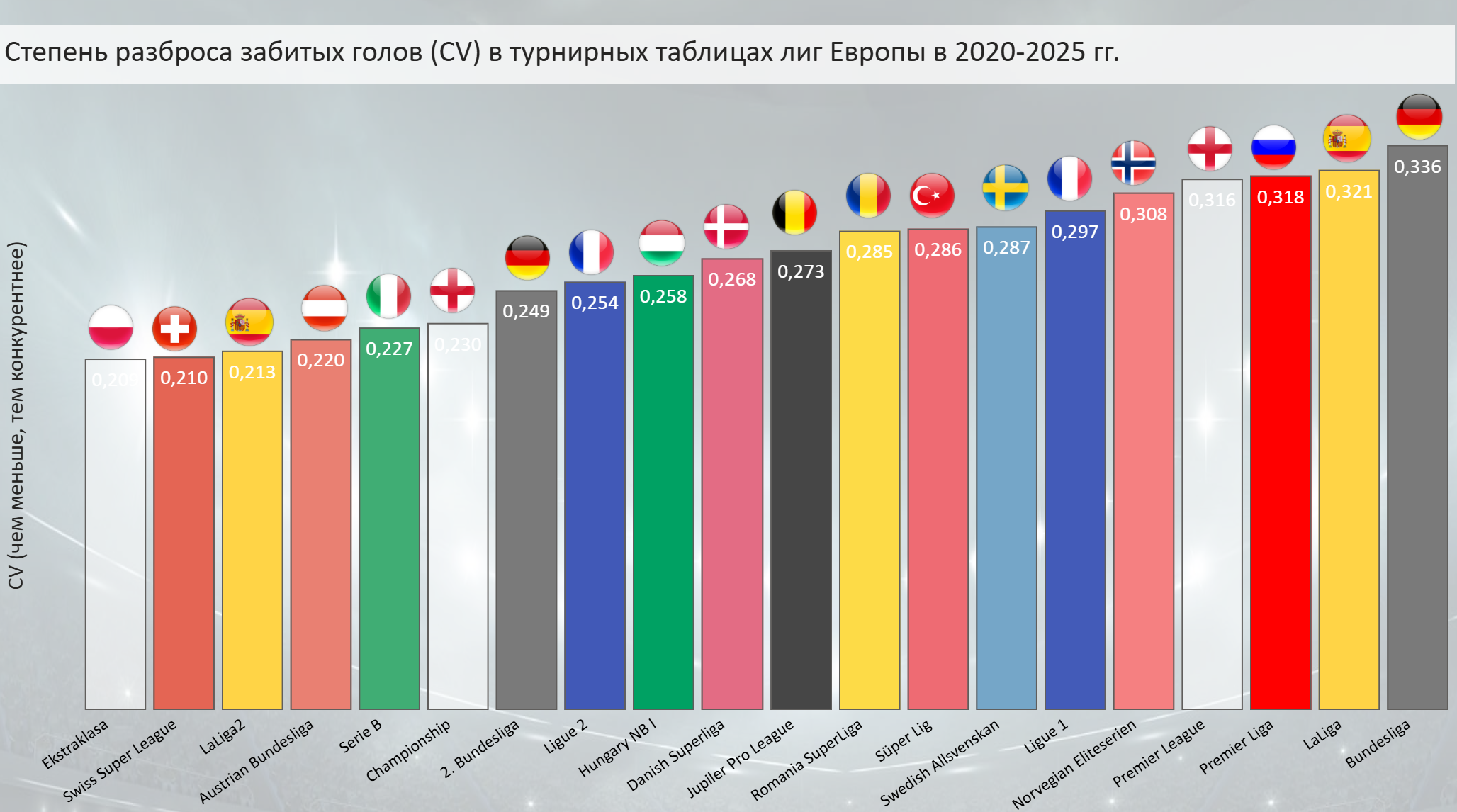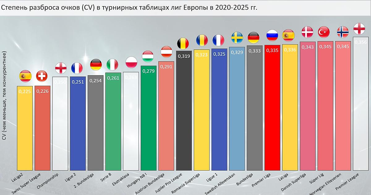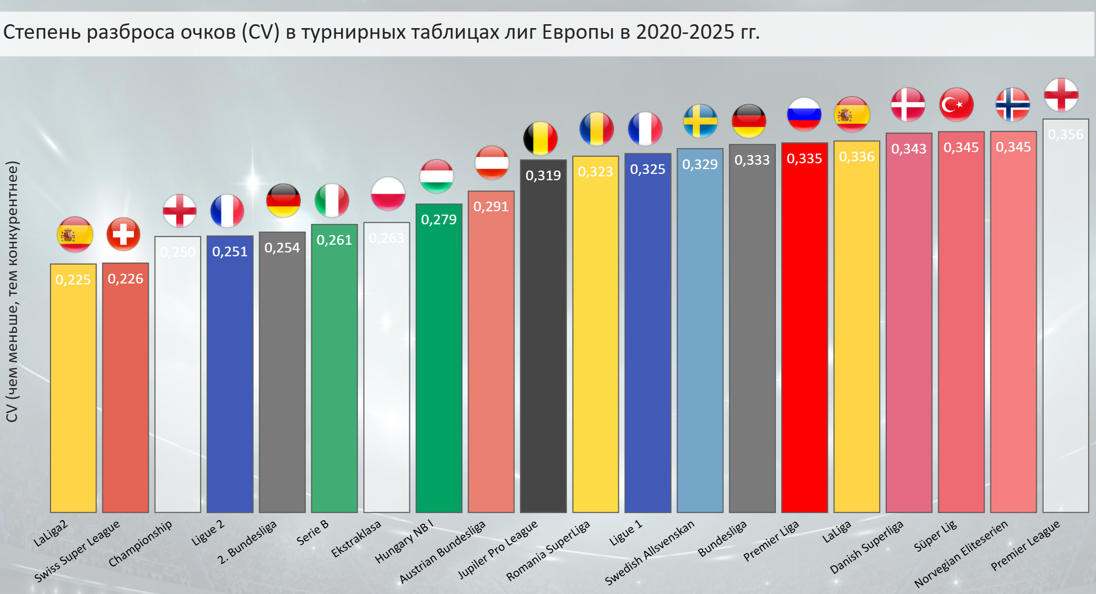 - По этим данным считаем разброс между позициями за каждый сезон с помощью коэффициента вариации (CV), а затем берем среднее за 5 сезонов. Чем ниже CV, тем меньше разрыв между командами – значит, лига более конкурентная.