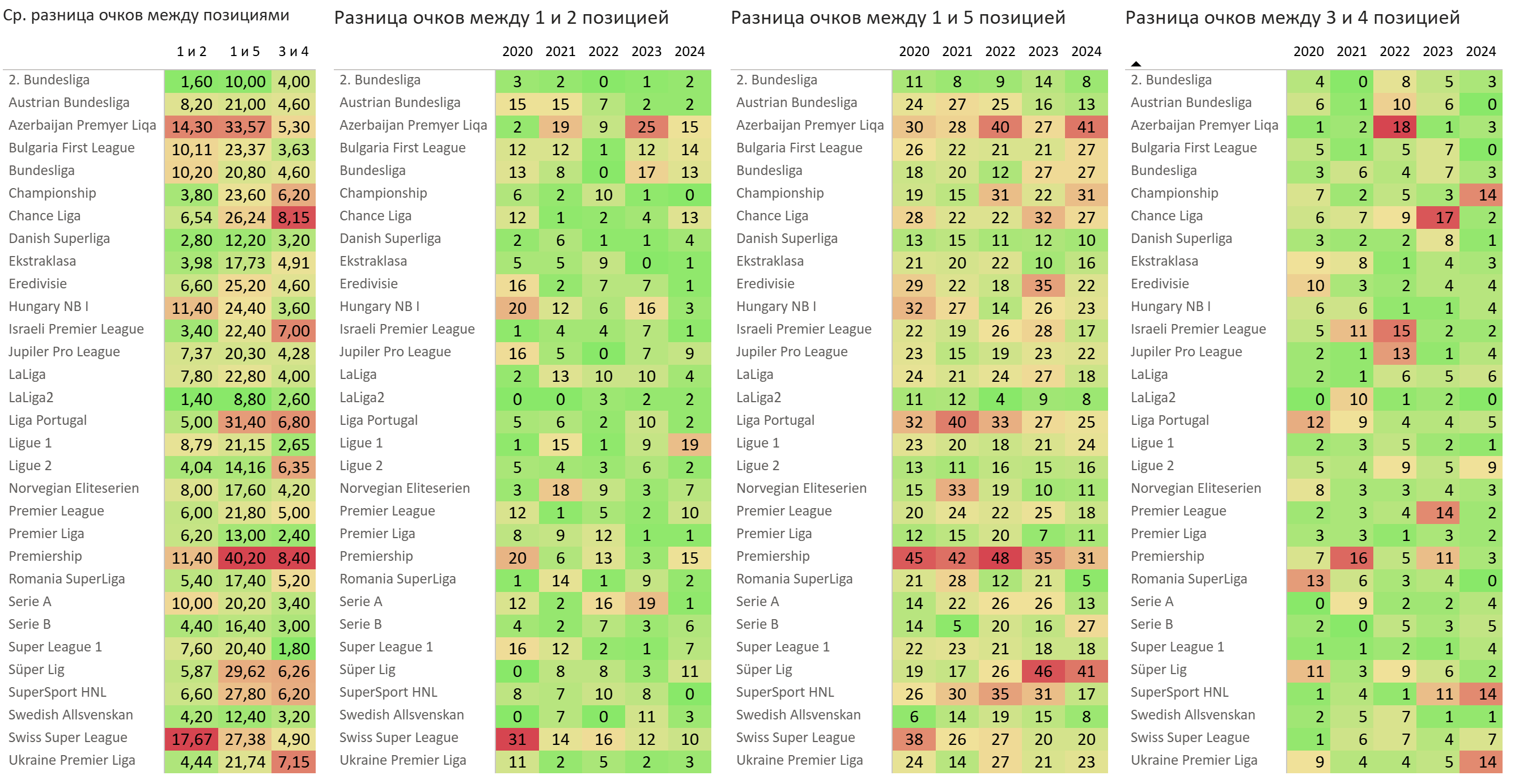 В среднем за 5 сезонов наименьшая разница между 1-м и 2-м местами в «Ла Лиге 2» (1,4 очка), в «Бундеслиге 2» (1,6 очка), в «Датской Суперлиге» (2,8 очка); наибольшая разница в «Швейцарской Суперлиге» (17,7), «Азербайджанской Премьер-лиге» (14,3), в Шотландии (11,4) и Венгрии (11,4). 5-е место ближе всего к чемпиону в тех же лигах, а дальше всего — снова в Шотландии и Азербайджане, а на третьем месте – «Лига Португалии». В борьбе за медали (разница между 3-м и 4-м местами) по плотности лидирует греческая «Суперлига 1» (1,8 очка), на втором месте – «Российская Премьер-лига» (2,4 очка), далее идет «Ла Лига 2» (2,6 очка).
