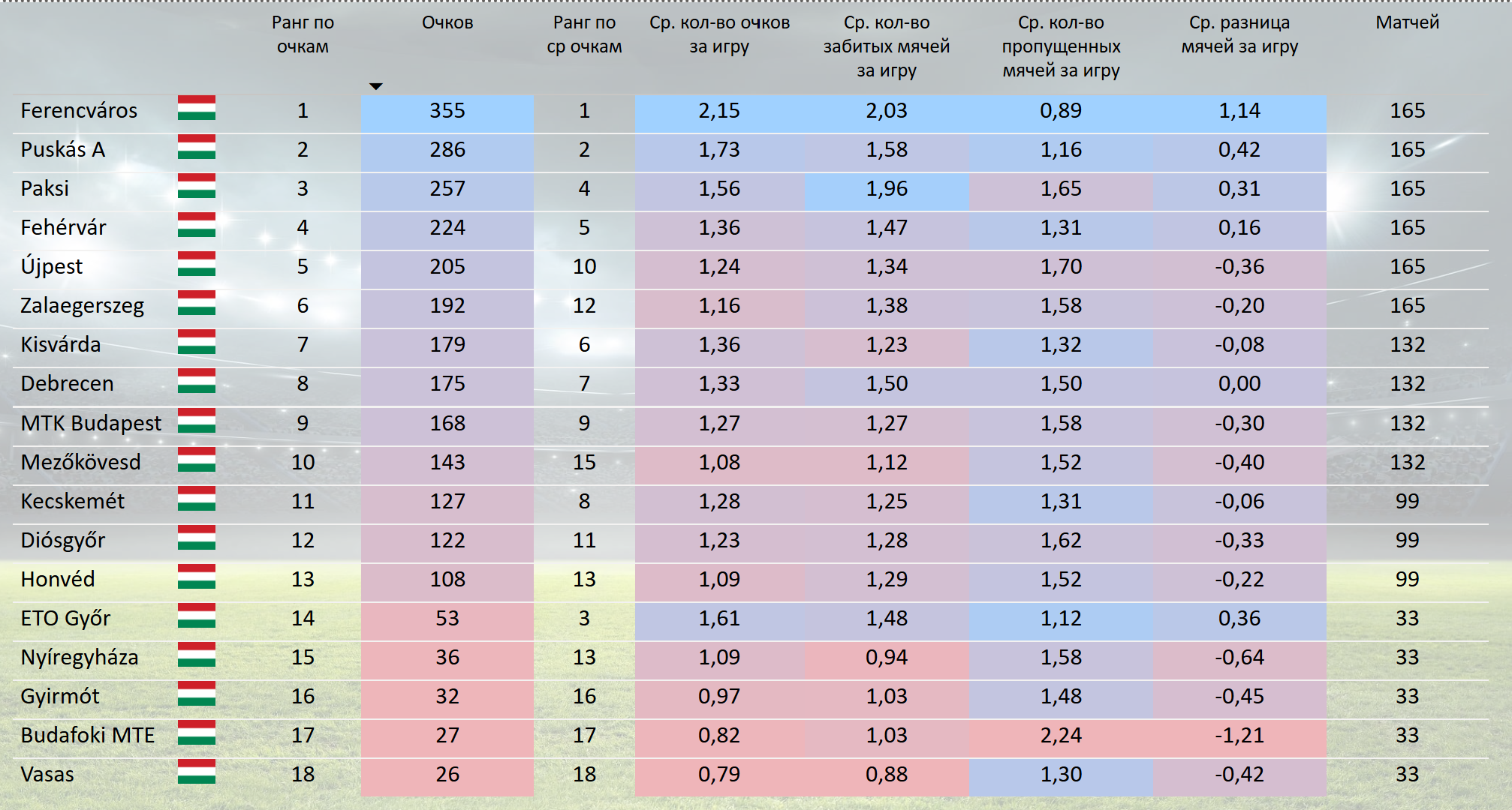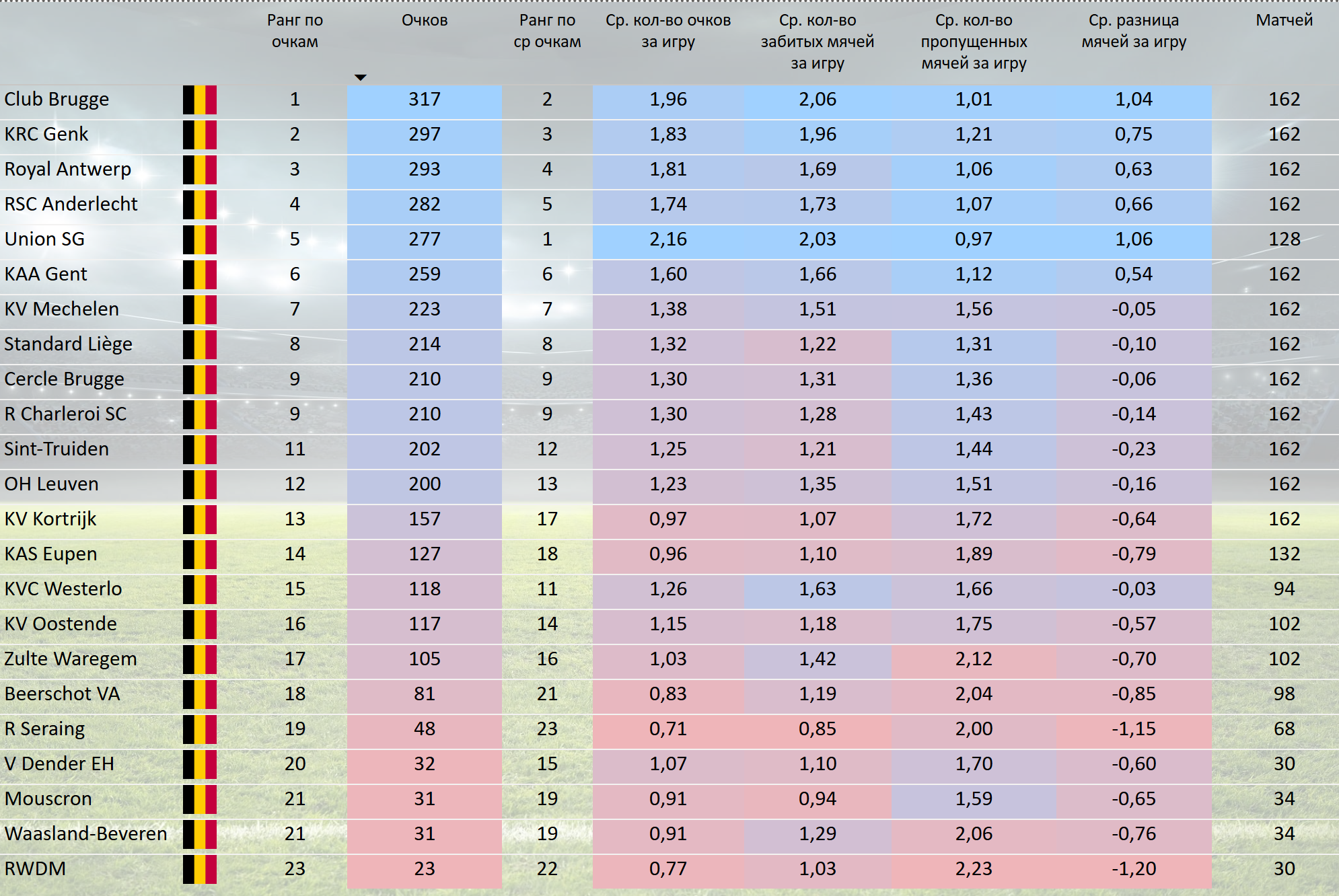 Используем статистический анализ разброса очков и голов между турнирными позициями в высших и вторых дивизионах топ-5 ассоциаций за последние 5 сезонов. Подробнее: