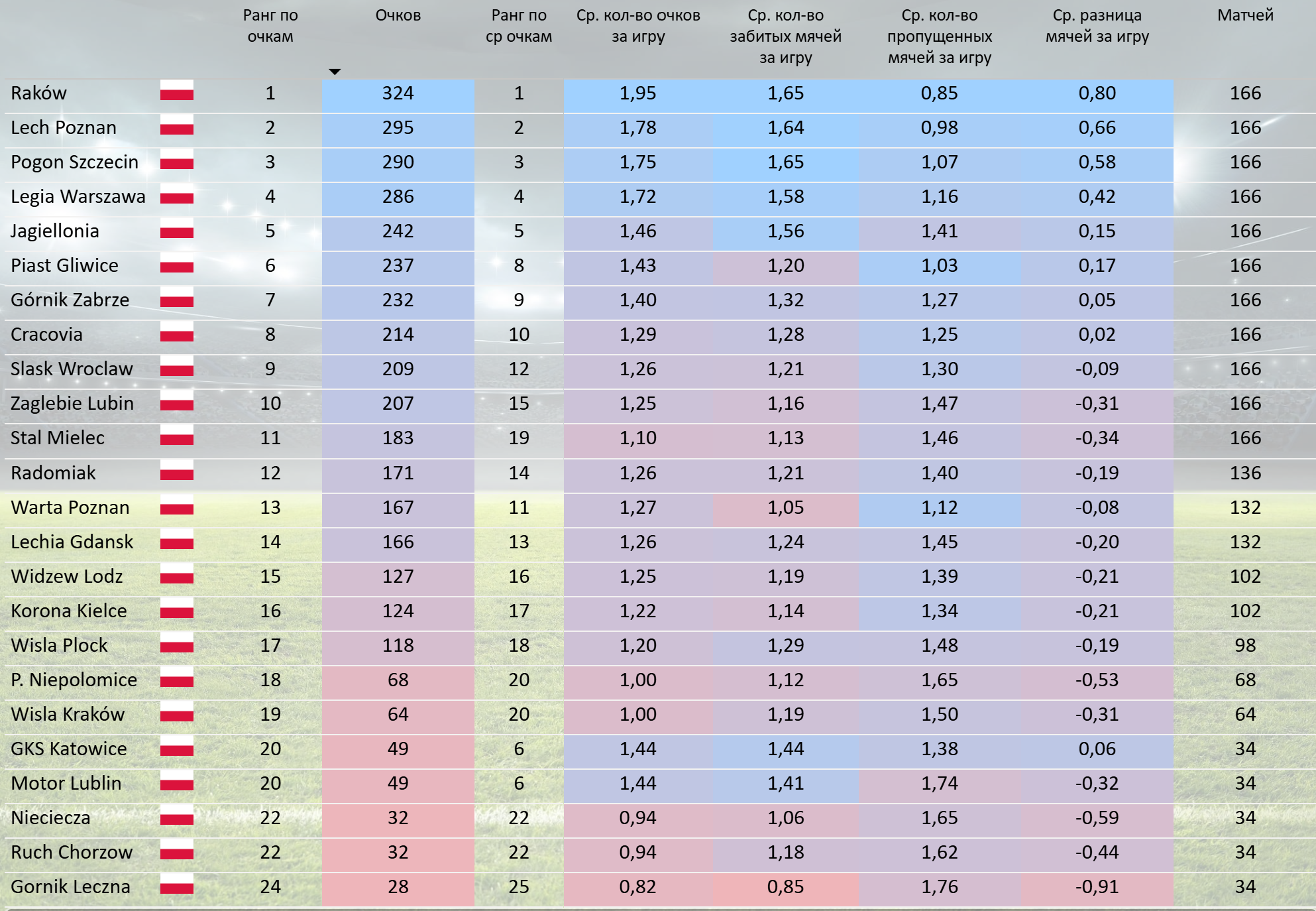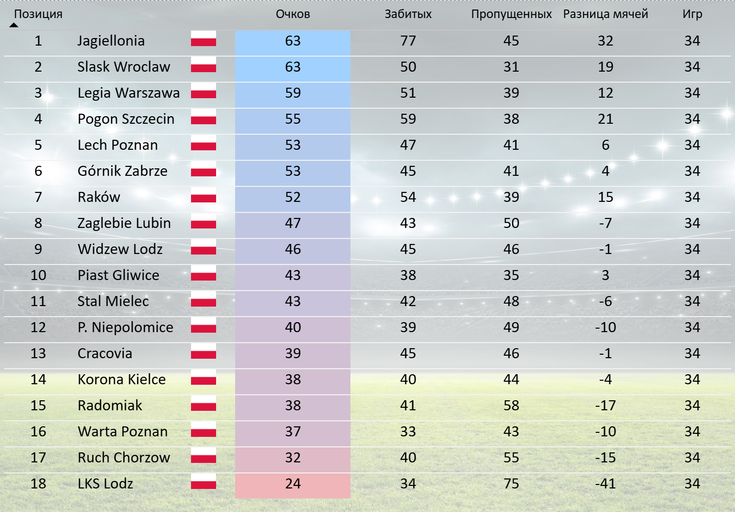 Среди высших лиг наибольшая плотность в турнирной таблице была в Польше в 2023 году. Здесь было 4-6 претендентов на чемпионство за несколько туров до конца.