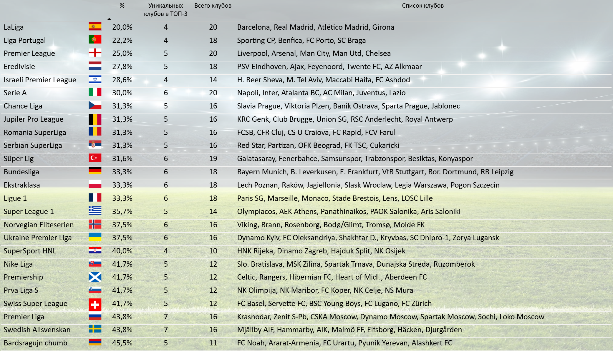 Больше всего уникальных клубов в топ-3 было в «Серии Б» (14), «Бундеслиги 2» (12), «Лиги 2» (11) и «Чемпионшипе». Среди высших лиг больше всего клубов с медалями в чемпионатах Болгарии (8), Беларуси (8), России (7) и Швеции (7). Среди высших лиг наибольшая доля клубов с медалями в чемпионатах Литвы, Азербайджана и Черногории.