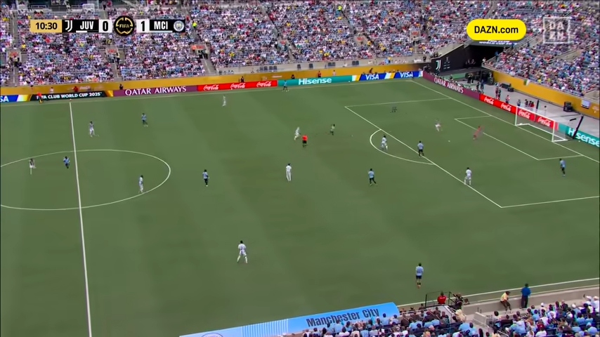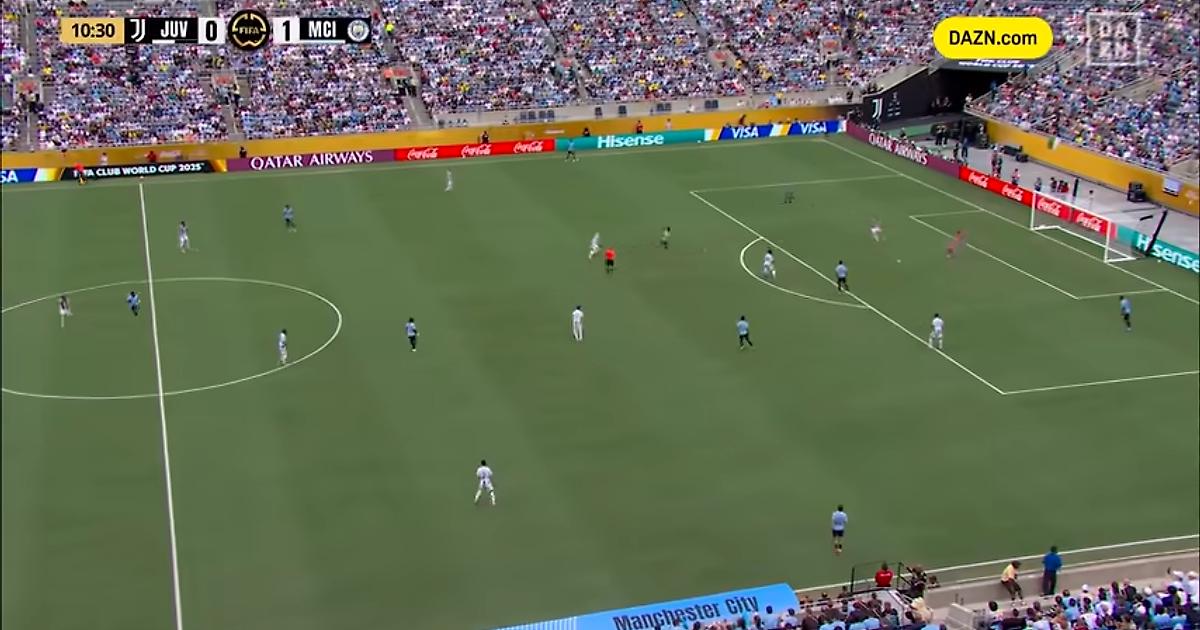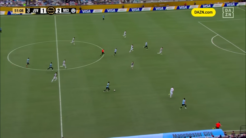 Здесь стоп-кадр сделан спустя пару секунд после такого паса - в хайлайты от DAZN сама передача не попала, а из трансляции ее не взять из-за авторских прав. Но зато хорошо видно, что 3 игрока Юве далеко отстали от мяча, а первая линия прессинга в кадр вообще не попала. Интересное дополнение к идеям Гвардиолы с тотальным владением против команд, что рискнут прессинговать МС в новом сезоне.