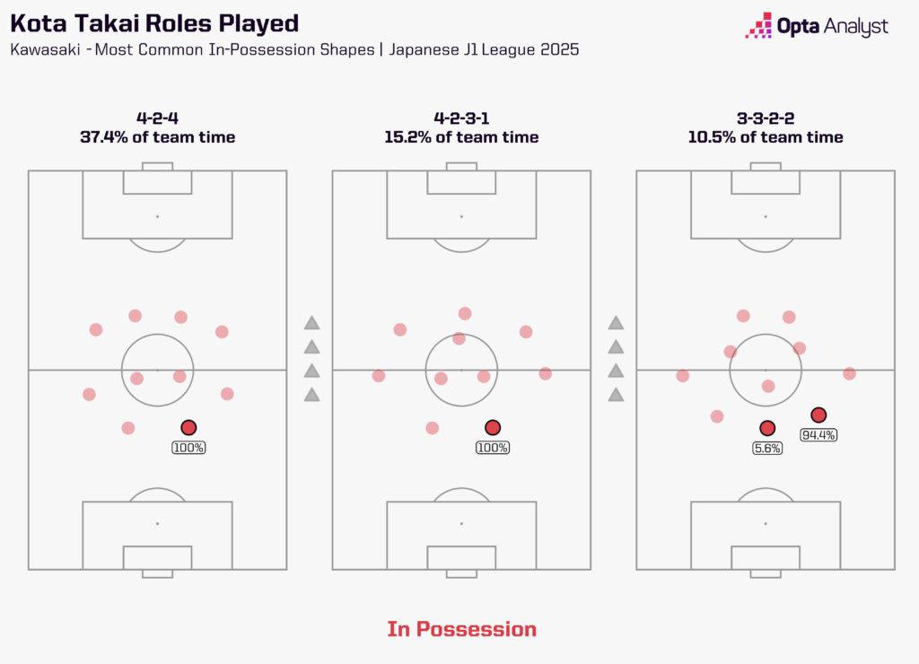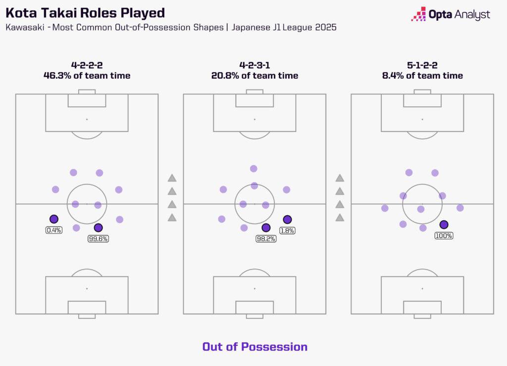 Как вы можете видеть из графических анализов ниже, Такаи в основном играет в качестве правого центрального защитника в схеме с четырьмя защитниками, хотя иногда он выступал справа в схеме с тремя защитниками.