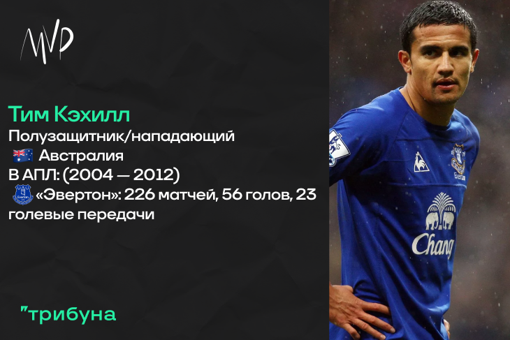 Переходим, пожалуй, к главной звезде в рамках нашей сегодняшней подборки. Тим Кэхилл, игрок сборной Австралии, который на юношеском уровне чуть-чуть поиграл за команду Самоа, начинал играть в футбол на профессиональном уровне в составе лондонского «Миллуолла», где сначала своими голами помог клубу выйти из третьего дивизиона во второй, а затем и привлечь к себе внимание уже команд из Премьер Лиги. Летом 2004 года Тима за 2.20 миллиона Евро подписал ливерпульский «Эвертон», аккурат в преддверии исторического сезона-2004/05. Итоговый вклад Кэхилла в успех был колоссальным – в свой первый год на столь высоком уровне атакующий игрок отличился одиннадцать раз, добавив к этому еще и одну голевую передачу. Сразу скажу, что больше Тим столько в рамках АПЛ не забивал, но, впрочем, данный факт совсем не помешал ему стать одним из самых заметных футболистов в Чемпионате в рассматриваемом временном цикле.