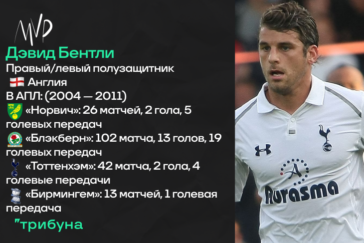 Теперь же рассмотрим одного из самых талантливых футболистов нулевых годов из Англии. Правда, чья карьера сложилась крайне неудачно и явно завершилась раньше времени. Обязательно сделаю ремарку в начале повествования о Дэвиде Бентли – воспитанник лондонского «Арсенала» успел провести один матч за основу в АПЛ в сезоне-2003/04, но, конечно, об этом помнят лишь единицы. Во избежание нагромождения текста, в инфографику это событие не включено, но оно было. По-настоящему же все для полузащитника начиналось с аренды в «Норвиче». Тогда англичанин, которого из-за схожего амплуа, имени и первых букв фамилии постоянно сравнивали с Бекхэмом, отыграл двадцать шесть матчей в АПЛ. Впрочем, семь результативных действий Бентли не помогли «канарейкам» сохранить прописку в высшем дивизионе.