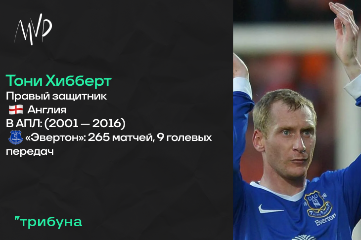 Включение Тони в подборку отнюдь не случайно. В своем роде, англичанин является футболистом достаточно необычным – шутка в деле, за пятнадцатилетний карьеру крайний защитник не забил ни одного гола в официальных матчах, хотя наиграл их, как видно из инфографики, он не мало. Да и результативных передач Хибберт делал очень мало – менее десяти штук в рамках АПЛ. Это, во многом, объясняется тем фактором, что данный герой – классический фланговый защитник из старого футбола. Того, когда на эту позицию в школах отправляли ребят без особой техники и иных навыков, но умеющих пахать и усердно отрабатывать сзади. Вот Тони особо в атаку и не подключался, вот статистику себе и не набил. Но, несмотря на все это, для болельщиков «Эвертона» этот игрок – легенда. Настоящий пример преданности любимой команде, прошедший с коллективом взлеты и падения. Игравший за клуб от начала и до конца карьеры.
