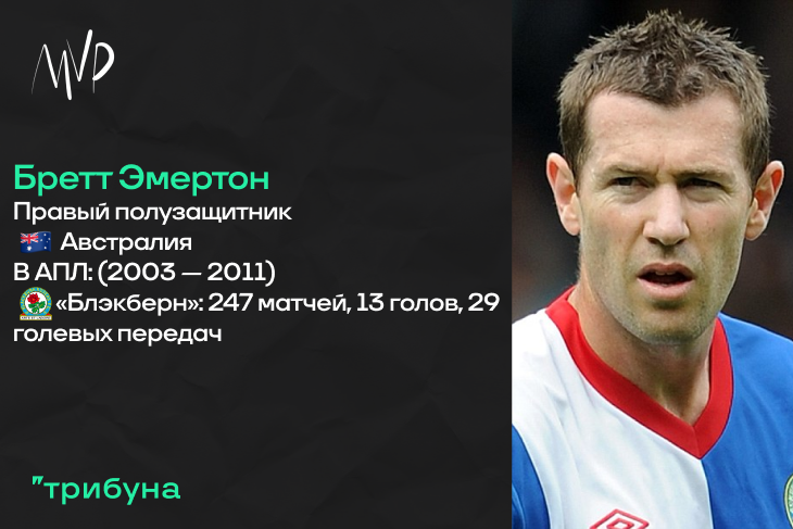 Причина попадания Бретта Эмертона в подборку также достаточно тривиальна. Еще один футбольный пахарь, не имеющий выдающихся технических данных, умеренно быстрый, способный подать с фланга или ударить, если того требует ситуация. В памяти автора статьи этот австралиец запечатлен бегущим по правому флангу с опущенной головой, после чего всегда шла попытка доставить мяч в штрафную площадь. И в этом фрагменте стоит отметить, что тот «Блэкберн», как и «Сток», вспоминается отдельно как очень самобытная и интересная, в первую очередь с точки зрения персоналий, команда. Сейчас таких, честно говоря, нет.
