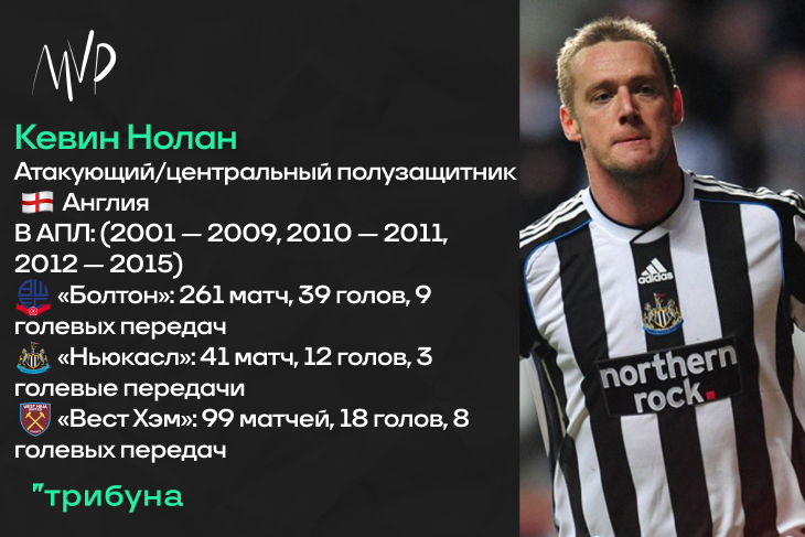 Этого футболиста вы регулярно вспоминали в комментариях к предыдущим материалам этой серии. И оно вполне заслуженно – Кевин Нолан провел на уровне Премьер Лиги свыше четырехсот поединков. У болельщиков со стажем, конечно, англичанин ассоциируется исключительно с «Болтоном», воспитанником которого и является. Вместе с «рысаками» Нолан поднялся в высший дивизион в 2001 году, уже будучи важным игроком стартового состава. Сэм Эллардайс активно использовал молодого полузащитника, а тот отвечал за оказываемое доверие сполна – несколько раз Кевин набирал десять и больше результативных действий за сезон, а команда при этом довольно быстро перешла в ранг крепких середняков, периодически даже замахиваясь на попадание в Кубок УЕФА. Оставался основным полузащитник и при Сэмми Ли, и при Гэри Мегсоне.