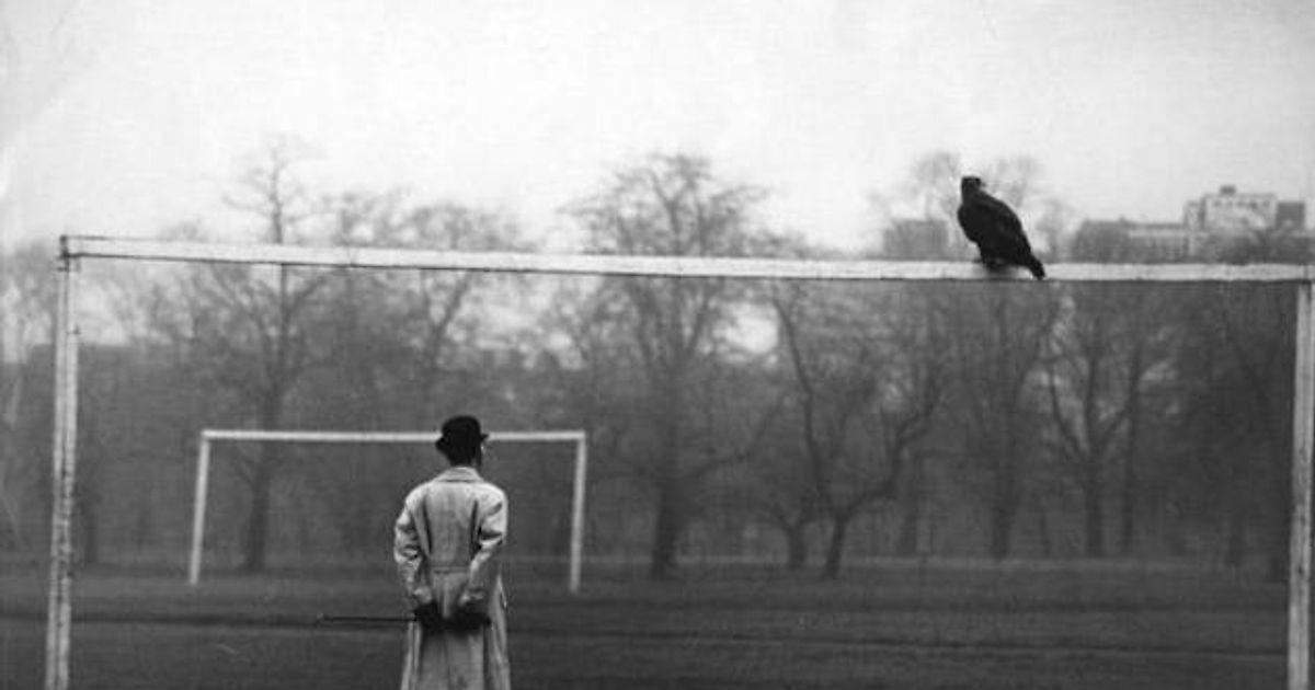 Золотой орел Голди, сбежавший из лондонского зоопарка в 1965 году, отдыхает на перекладине футбольных ворот на поле в Риджентс-парке
