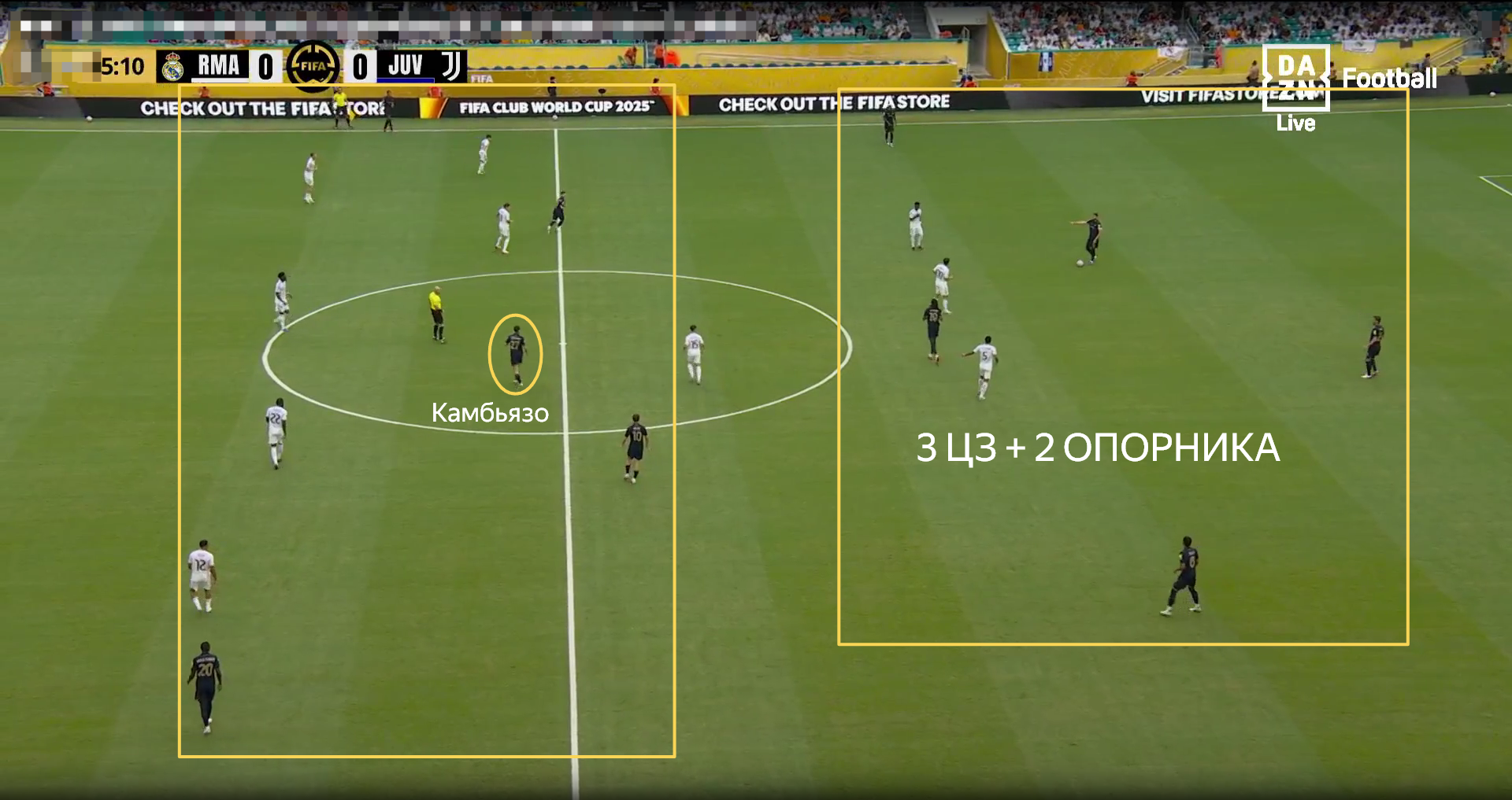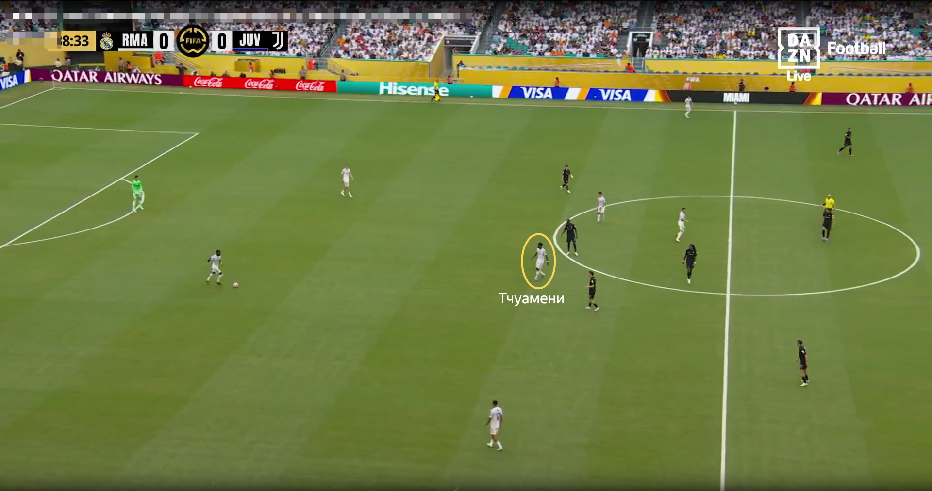 Второй матч подряд Хаби Алонсо выбирал схему с тройкой центральных защитников. В такой расстановке место самого центрального в тройке занимал Тчуамени. Против «Ювентуса» еще по ходу первого тайма позиция француза изменилась – теперь Орельен располагался в центре поля.