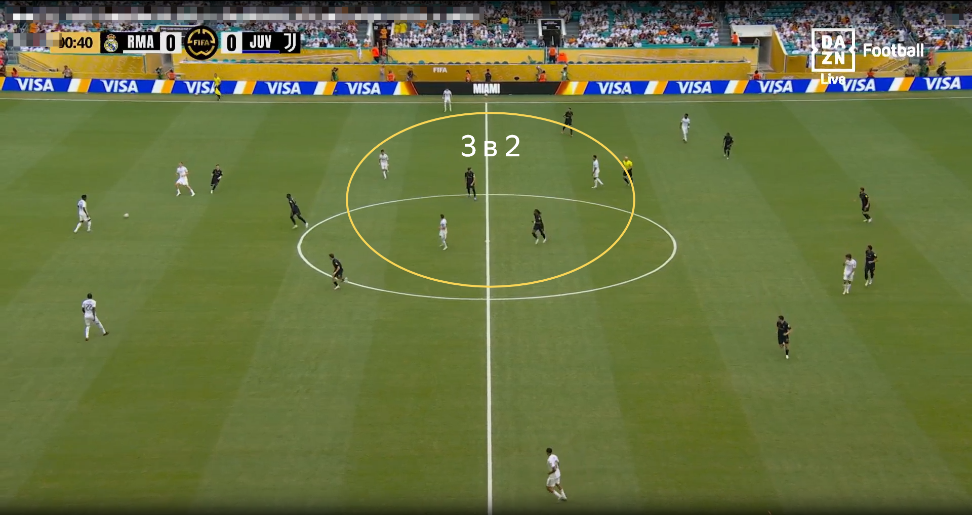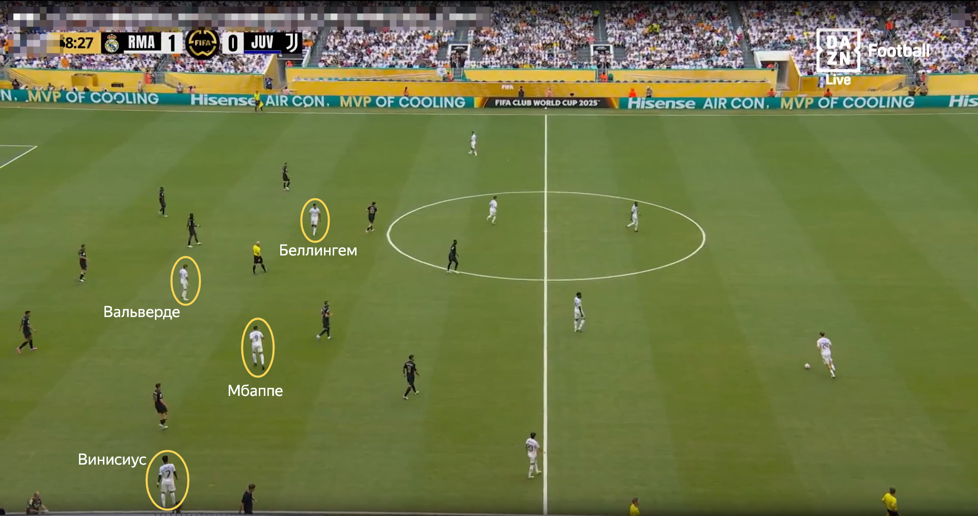 По цепочке пустота образуется в центре атаке, где нет классического центрального нападающего (Гонсало Гарсию заменили). За заполнение центра атаки в такой конфигурации отвечали Беллингем и Вальверде, которые своими рывками заполняли штрафную.