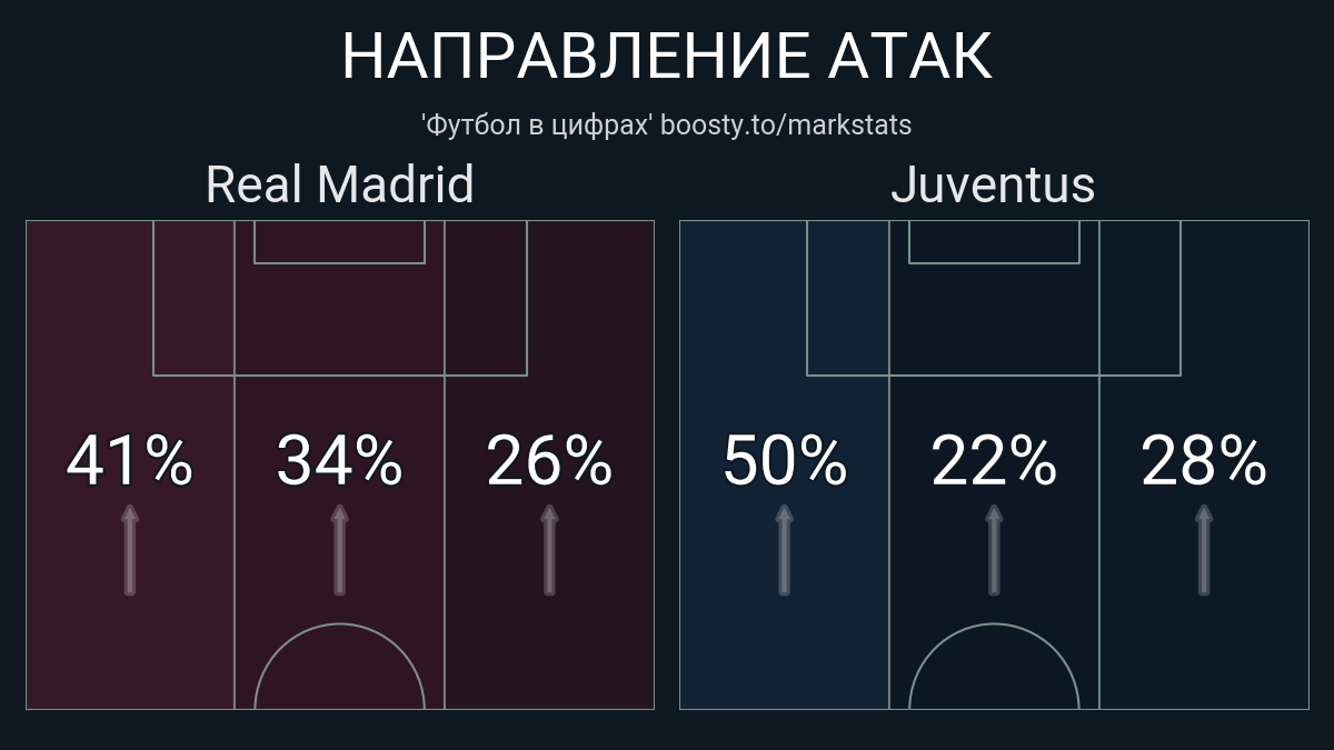 Схемы команд накладывались друг на друга таким образом, что нередко в центре поля «Мадрид» имел численное преимущество 3 в 2. Атакующая тройка «Ювентуса» ориентировалась на центральных защитников «Реала», а вот в центре двух опорников зачастую не хватало, чтобы перекрыть всех полузащитников соперника.
